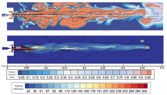 Figure 23 displays the volume and velocity distribution of the core section of the water jet at a relatively distant time after a period of development. It is observed that the core section only lasted a distance of 0.1 m when maintained at a longer distance, which did not display the superiority of higher gas supply compared to 0.15 m observed in the above. Simultaneously, excessive suction of the external medium caused the cavity to start breaking and overflowing at the front end. At the tail of jet development, as the gas momentum is depleted, the cavities gradually become affected by buoyancy and begin to move upwards.