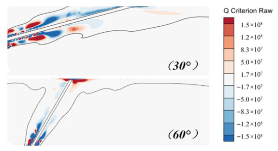 However, as the tangential angle increases, this study found that the necking phenomenon of the cavity jet becomes more severe. To illustrate this phenomenon, Figure 25 show the vorticity distribution under the Q criterion at a certain moment. It is observable that the vorticity is predominantly concentrated in the near-wall region and the jet outlet region.