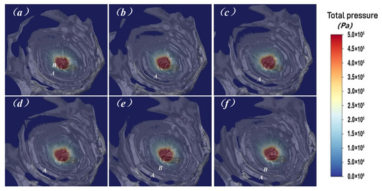 As the supercavitating jet continues to develop, the behavior of the cavity on the wall is depicted in Figure 26. The transparent material on the target plate is a rendering of the gas profile near the wall. It can be seen that when the supercavitating jet impacts the wall at 60°, the gas jet, influenced by gravity, adheres to the surface of the target plate and spreads around like water waves, then dissipates or overflows from the target plate. The reason for the appearance of waves is similar to the previously mentioned bulging phenomenon. From wave B in Figure 26f, it can be seen that wave B is a continuation of the upstream bulging phenomenon. The bulging jet part, upon striking the target plate, and over time, gradually evolves into an arc-shaped wave, as illustrated in Figure 26f. Meanwhile, due to the strong nonlinear instability of the wave surface, it is still possible to experience gas cavity fragmentation during the forward development of the airflow. As shown in Figure 26a,b, the gas cavity downstream of wave A has begun to rupture, and the rupture is gradually intensifying over time.