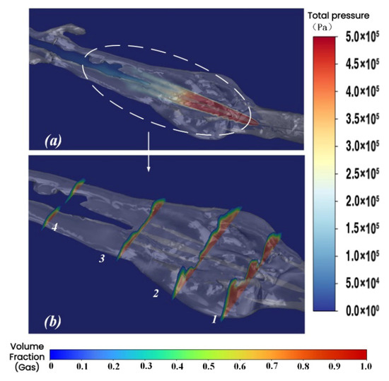 The distribution cloud map of gas and liquid volume fractions during the development stage of the wall jet is presented in Figure 24, where red denotes the volume fraction of the gaseous phase. It can be seen that the flow regime in the initial stage of the jet is basically the same as described above, showing necking expansion. However, due to the direct impact of the jet downstream on the target plate, the impact of downstream necking will not be transmitted to the upstream, and even if there is swelling in the upstream, it can rapidly progress downstream. Consequently, unlike the unconstrained jet, the initial stage of the jet, even with the same working parameters as described above, will not experience severe necking expansion, causing the gas jet to break and even affecting the core area of the water jet. Instead, a relatively stable gas cavity is exhibited.