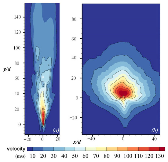 It is worth noting that as the jet continues to develop, the broken jet will lose the continuous structure of the core section of the water jet and diffuse with high momentum towards the outside of the jet axis. As illustrated in Figure 21b, this phenomenon further intensifies the instability of the jet.