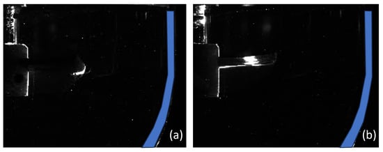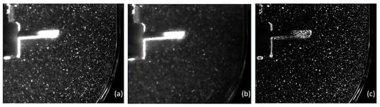Subsequently, the images registered for each camera were treated differently but with the same concept of creating a background image that represents noise and then subtracting the generated background from the raw images. The liquid-phase images followed the same approach as used before, by computing the minimum power mean grayscale values from the set of images (also known as a generalized mean) to form a unified background image. Insignificant noise was found at v%, as the presence of PMMA particles at these levels did not deteriorate the quality of the image, thanks to RIM between both phases. As previously mentioned, this was validated in a previous study [43]. On the other hand, for particle-phase images, a background needs to be created for every image. Since PMMA microparticles were added accordingly up to v%, noise propagated with increasing particle concentration, resulting in either high bright spots or gray areas in the images. An example is shown in Figure 4 where the generated background is subtracted from the raw image to eliminate as much noise as possible. The background creation was based on a sequence of image processing operations: a median filter, an erosion followed by a dilation, and finally a shock filter, each applied with a pixel window (Dantec Dynamics v7.3). Noticeably, near the tank wall, where the laser first hits, low noise from PMMA microparticles is found, which is confirmed by the black area from the background image (Figure 4b) in that region. As the laser beam travels farther into the medium, PMMA-induced noise becomes increasingly prominent, but the four-stage image processing tool effectively removes this noise.