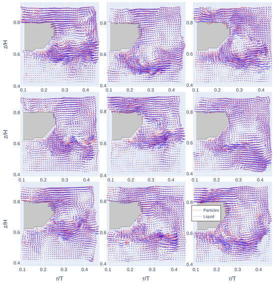 First, several instantaneous superimposed vector maps of both particles (red) and liquid phases (blue) are shown in Figure 5, where one may notice that the velocity vectors are not perfectly matched, yet not completely diverted. The main difference that could be spotted is not only the magnitude, but also the orientation of the vectors, i.e., the angle between the velocity vectors, especially in the impeller region. The extent of such variations will be further discussed in the slip velocity Section 3.2.