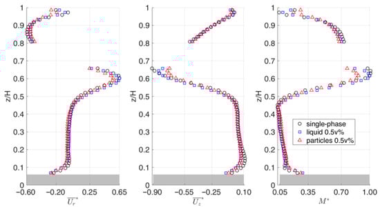 Near the wall, at r/T= 0.48, where lower velocities are present, small differences can be noticed on Figure 9. For the mean radial velocity term (Figure 9 Left), liquid phase at = 0.5 v% is slightly greater than that of single phase and dispersed phase by along the z-axis at 0.6 < z/H < 0.65 and 0.8 < z/H < 0.9. However, for the mean axial velocity term (Figure 9 Center) and velocity magnitude (Figure 9 Right), particles lead the liquid phase without and with = 0.5 v% fractions along the z-axis by . Although the variations at r/T = 0.48 are considered not as significant as those at r/T = 0.22, one may notice that the behavior near the wall is opposite to that in the impeller region, where the particles lead in the zone near the wall and lagged behind in the impeller vicinity. Note that a radial plot is reported in Appendix A in Figure A1.