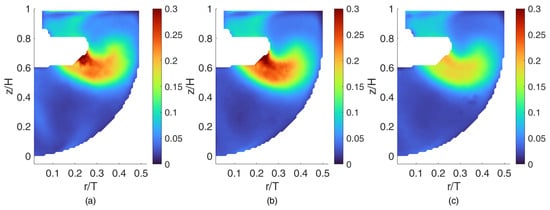 Moving on to the turbulence levels, more clear and obvious differences are spotted in the contour plots of Figure 10. The figure shows the mean turbulent kinetic energy TKE of the single-phase flow (Figure 10a), liquid phase at = 0.5 v% (Figure 10b) and solid phase (Figure 10c) at the same particle volume fraction. The TKE attains its maximum value in the flow discharge region and progressively decreases toward the wall, as expected. This covers the bottom-half of the flow circulating loop. In the last phase of the circulating loop, above the impeller, low quantities of turbulence are also depicted. When comparing the liquid phases with and without particles, the TKE just at the blade tip is consistent with a maximum value reaching , while in the area around it, liquid-phase turbulence with = 0.5 v% has slightly higher magnitudes. As for the solid-phase turbulence at = 0.5 v%, the behavior is clearly different, where TKE is much lower in the impeller vicinity compared to both liquid cases, averaging around , that is, 1.5 times lower than the corresponding liquid-phase peak, highlighting a visible damping effect of particle addition on solid-phase turbulence.