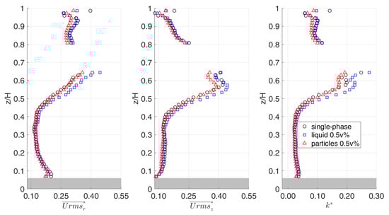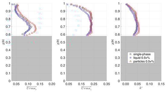 On the wall side, where low levels of turbulence appear, a profile cut at r/T = 0.48 is covered in Figure 12. The radial r.m.s. velocity plot (Figure 12 Left) highlights that the solid phase values at = 0.5 v% surpass those of the single phase and liquid phase at the same concentration by 28%. This effect is drastically diminished for the axial term (Figure 12 Center), where the three plots are almost overlapping. At last, the resulting TKE (Figure 12 Right) reveals a 15% increase for the solid phase near the wall; however, the values at that position are very low, and, thus, the difference could be considered insignificant.