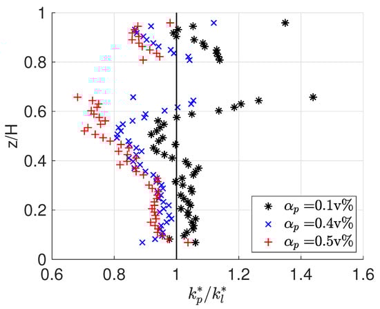 Interestingly, one can replot a comparative axial profile cut at r/T = 0.22 between the standout cases. Figure 14 reveals the ratio of TKE of the solid phase to that of the liquid phase for = 0.1, 0.4 and 0.5 v%. For reference, a solid vertical line is also shown as a unity. For = 0.1 v%, the ratio is generally higher than 1, and it could reach 1.2–1.4 times in the impeller stream, only to drop to 0.95 at 0.4 < z/H < 0.6. However, at = 0.4 and 0.5 v%, the ratio is always lower than 1, varying around 0.85. At 0.4 < z/H < 0.6, the TKE ratio drops even lower for = 0.5 v% to reach 0.5. This means that TKE of the dispersed phase drops 50% compared to that of the liquid phase in this segment. Few researchers revealed the same response of particles in terms of turbulence levels. Unakdat et al. [45] noticed a drop in r.m.s. intensities with increasing volume fractions (at = 0.5 v%). Sommer et al. [47] also reported a drop in the turbulence levels of the solid phase, with values always lower than that of the liquid phase (at = 0.1 v%), whereas Virdung and Rasmuson [44] observed an opposite pattern, where turbulence levels for both solid and liquid phases increased with the addition of particles (at = 1.5 v%).
