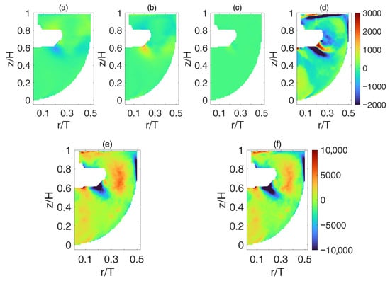 On the other hand, the estimated drag force is 3–5 times higher than that of the lift force, as can be seen in Figure 16e. This effect was noticed by Montante et al. [40], but with one order of magnitude higher than the lift force. Note that the authors estimated the drag force using the Schiller and Naumann standard base drag model [77], which was in turn modified by adapting the average of Equation (1). For that reason, and since the particle Reynolds number in this work is Rep < 3 (Figure A4 in Appendix A), the choice of Oseen’s drag coefficient is adapted [73] instead of Schiller and Naumann (for Rep < 1000). The main regions of drag are in the impeller region and near the wall, where the high axial slip velocity dominates, ranging between −10,000 and 10,000 N/m3.