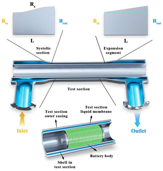 Seawater-activated batteries generate substantial heat during discharge, while the battery assembly is primarily constructed from insulating epoxy material with low thermal conductivity, as shown in Figure 2. During experiments, the heat generated by the battery is transferred to the electrolyte through convective heat transfer. Subsequently, this thermal energy is conveyed through spiral flow channels to the inner surface of the test section’s inner wall, then conducted to the outer surface of the inner wall, and ultimately dissipated to the cooling water via convective heat transfer. The cooling water is further cooled by a temperature control unit. Consequently, the flow characteristics of the cooling water in the water tunnel test section directly determine the battery’s cooling efficiency.