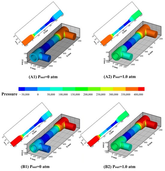 Pressure distributions under different flow velocities at outlet gauge pressures of 0 atm and 1.0 atm. (A1,A2) are pressure contour plots for a target flow velocity of 25 m/s in the test section at outlet gauge pressures of 0 atm and 1.0 atm, respectively; (B1,B2) are pressure contour plots for a target flow velocity of 26 m/s in the test section at outlet gauge pressures of 0 atm and 1.0 atm, respectively.