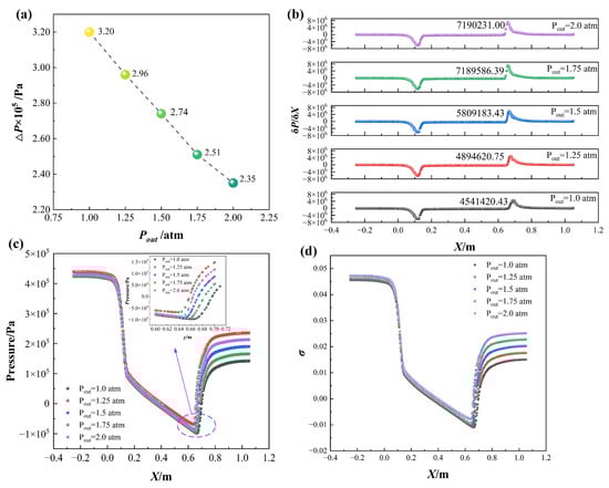 Pressure Loss under Different Outlet Gauge Pressures: (a) Pressure drop; (b) Adverse pressure gradient; (c) Static pressure distribution along the X-axis; (d) Cavitation number along the X-axis.