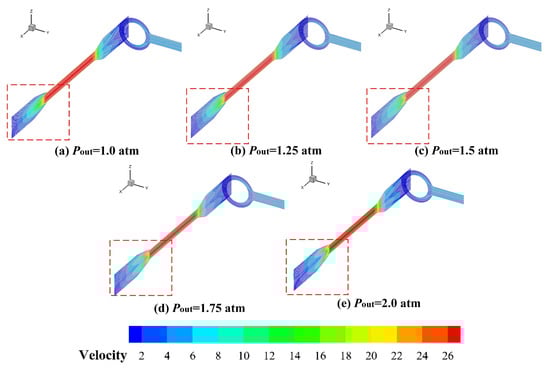 Velocity contour plots under different outlet gauge pressure conditions: (a–e) represent velocity distribution contour plots for the Y-direction cross-section at an outlet gauge pressure of 1.0 to 2.0 atm.