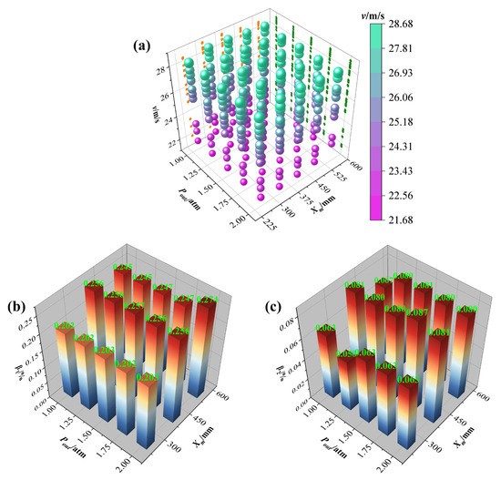Figure 10 presents the flow velocity distribution under different outlet gauge pressures. The velocity distribution in Figure 10a demonstrates that all cross-sections of the test section satisfy the design requirement of ≥25 m/s, with high-speed zones accounting for over 75% of the area and reaching a peak at X = 400 mm. This spatial pattern is directly related to the development mechanism of the turbulent boundary layer: as the flow progresses downstream, the boundary layer undergoes a transition from laminar to turbulent flow, reaching a fully developed turbulent state in the central portion of the test section. At this stage, the boundary layer thickness is minimized, velocity gradients are reduced to their lowest levels, and the flow structure achieves optimal conditions, significantly enhancing heat transfer efficiency through increased wall shear stress. Figure 10b,c show the flow non-uniformity parameters and in the test section, calculated using Equation (14) for cross-sections at X = 250 mm, 400 mm, and 550 mm under different outlet gauge pressures. As seen in Figure 10b, the values of primarily range between 0.202 and 0.256 across various operating conditions, remaining relatively high overall. In contrast, the values of in Figure 10c range from 0.060 to 0.081, significantly lower than . is sensitive to velocity extremes and primarily reflects localized flow separation and cavitation disturbances, while defined based on the root mean square, provides a more comprehensive characterization of the overall uniformity across the cross-section. A systematic reduction in both parameters with increasing outlet gauge pressure indicates that elevated pressure effectively suppresses cavitation and restrains the development of secondary flows by mitigating transverse pressure gradients. In the test section, both and remain below 1%, demonstrating favorable flow uniformity that contributes to improved battery cooling performance. From the perspective of comprehensive engineering benefits, the flow homogenization approach proposed in this study achieves significant thermal management enhancements at the expense of a certain level of energy consumption. Under an outlet static pressure of 2.0 atm, the flow-guiding structure introduces an additional pressure drop of approximately 2.35 × 105 Pa, corresponding to an extra fluid power requirement of about 141 kW at a flow rate of 0.6 m3/s. This energy expenditure yields two key advantages: first, it improves temperature uniformity within the battery module and reduces the maximum temperature. According to Arrhenius kinetics, each 10 °C decrease in operating temperature can delay the aging rate by approximately 50%, thereby extending battery lifespan. Second, the more uniform temperature distribution suppresses local hot spots, enhances the system’s thermal safety margin, and mitigates the risk of thermal runaway.