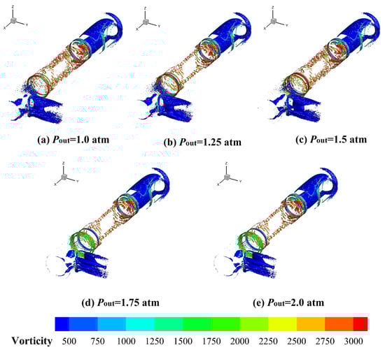 Vortex Structures Based on the Q-criterion: (a–e) Vorticity contour maps for outlet gauge pressures from 1.0 to 2.0 atm.