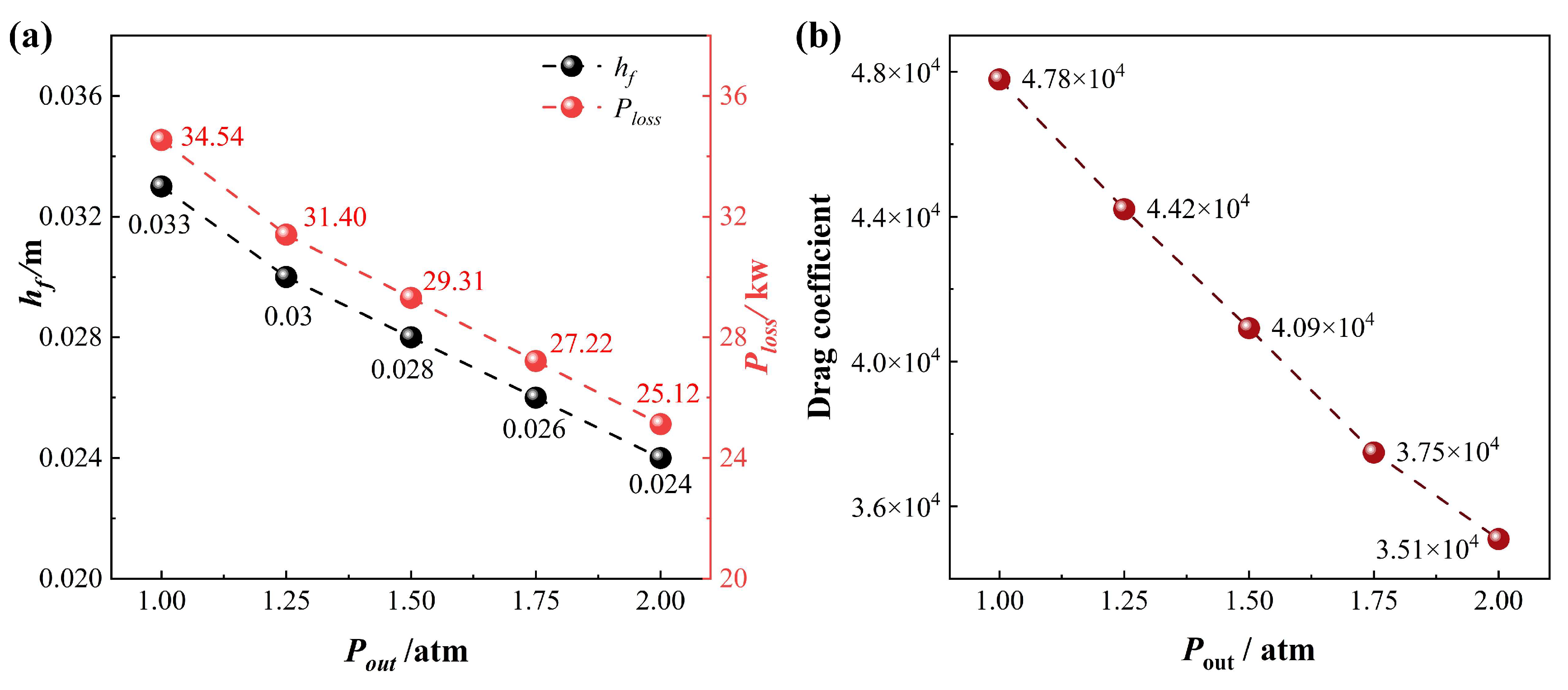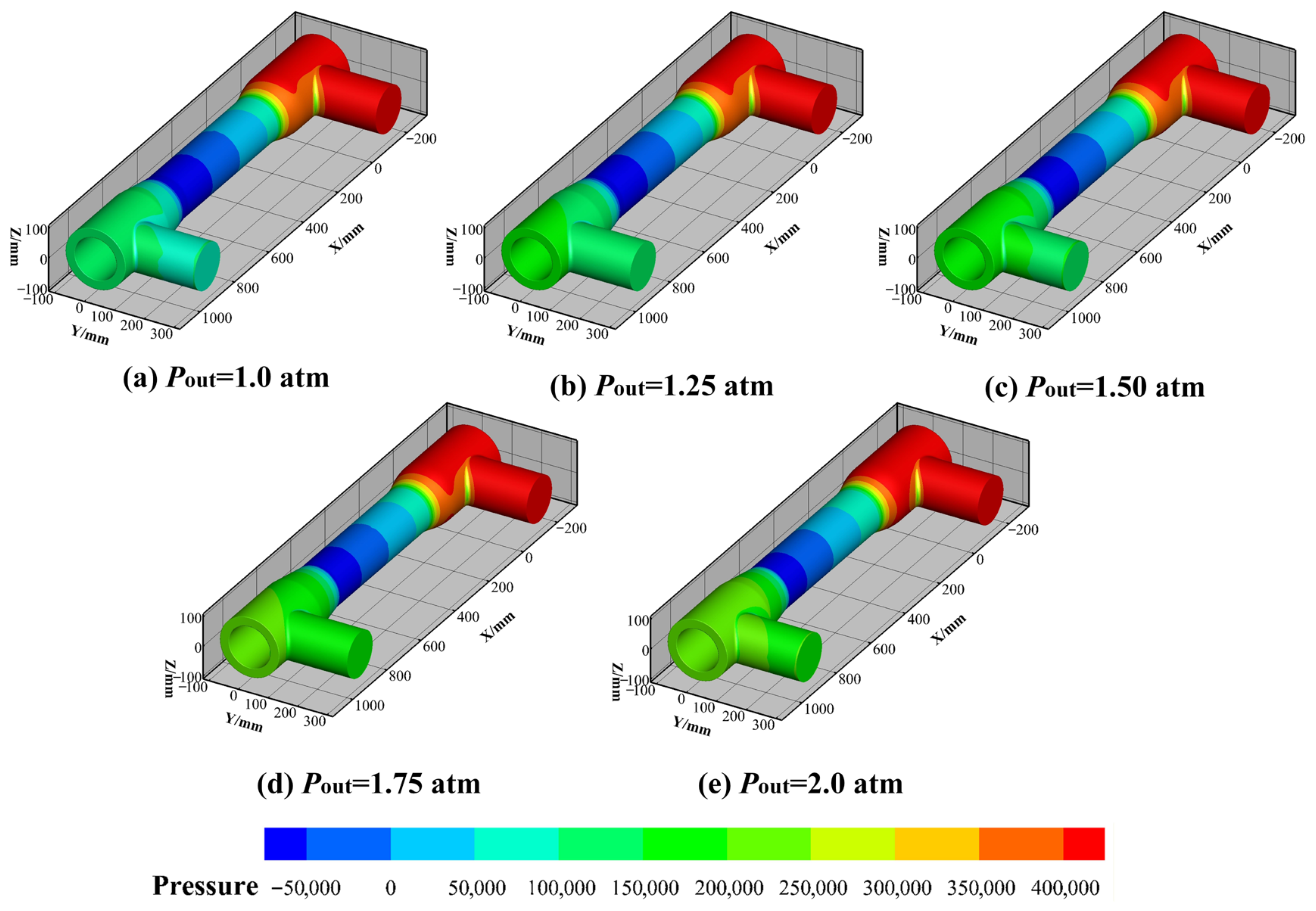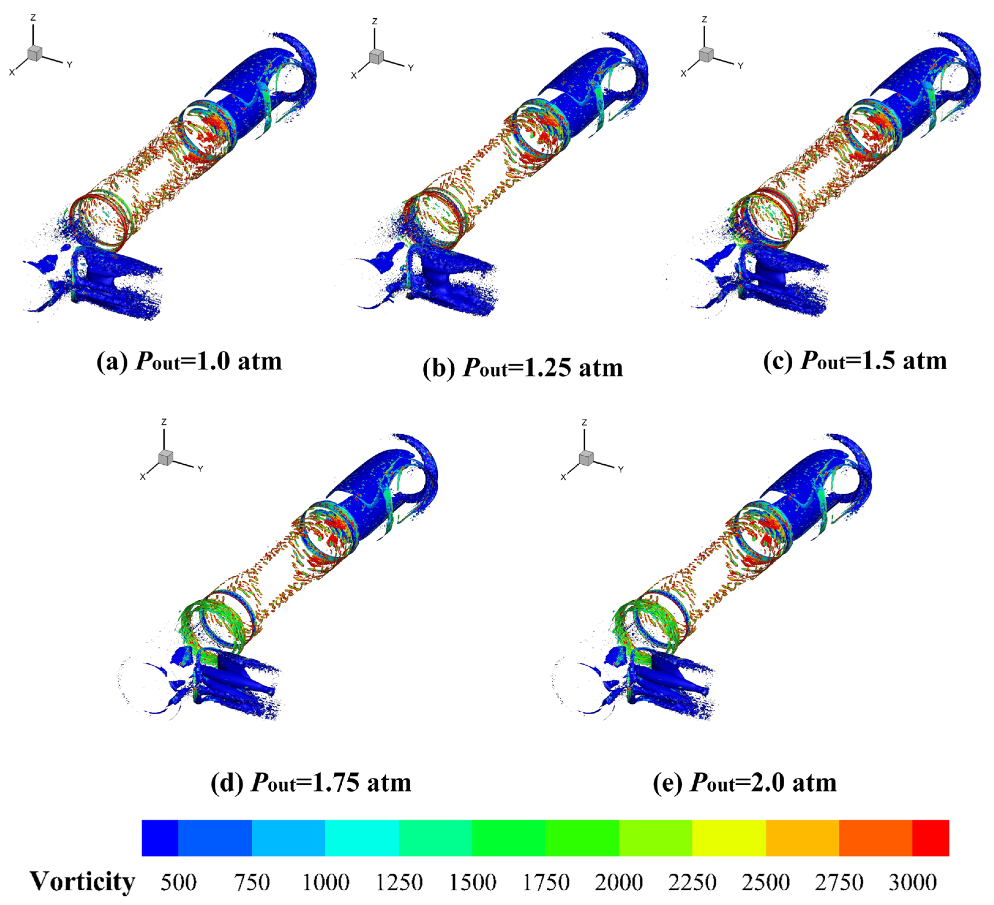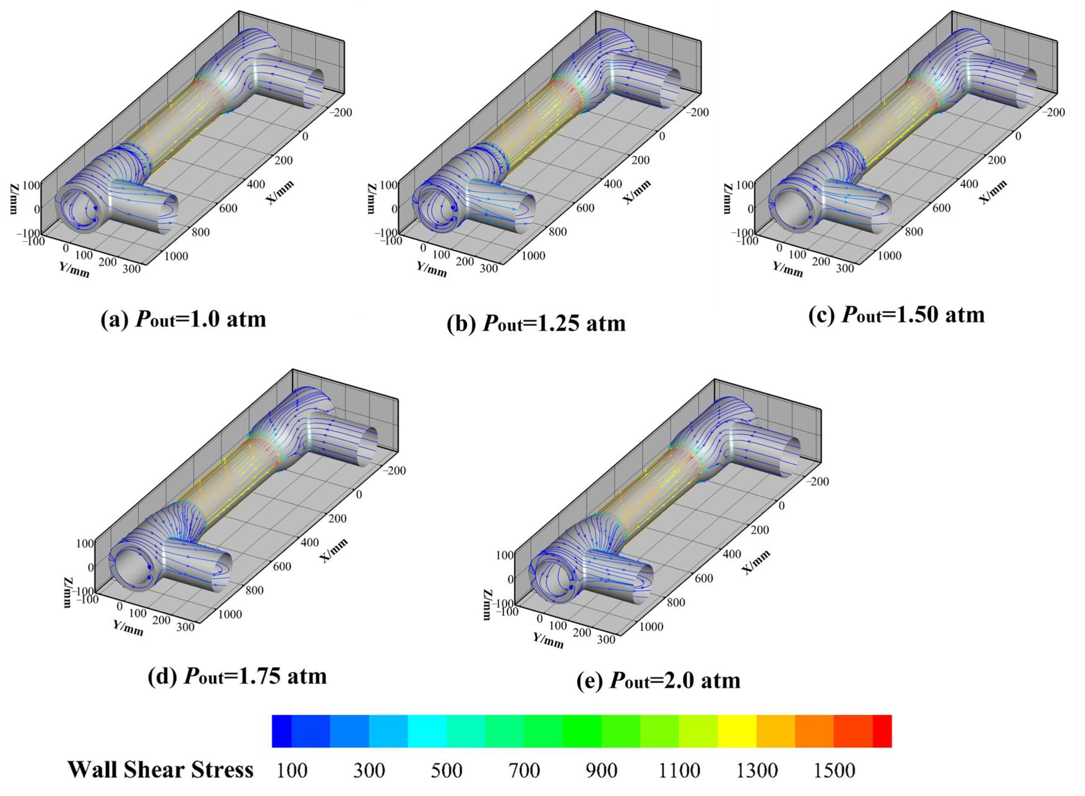 - As the outlet gauge pressure increases from 1.0 atm to 2.0 atm, the flow characteristics are significantly optimized: the pressure loss is reduced by 26.6%, the power loss decreases by 27.3%, and the drag coefficient drops by 26.6%. Meanwhile, the flow non-uniformity is controlled within 1%, and the proportion of high-speed flow regions increases to 75%, fully meeting the design requirement of a flow velocity ≥25 m/s. These improvements stem from the systematic regulation of flow mechanisms by the outlet gauge pressure: the elevated static pressure level effectively suppresses cavitation, eliminating the energy dissipation caused by bubble collapse; the stabilized pressure field inhibits boundary layer separation and secondary flows, promoting the migration of turbulence structures toward smaller scales; and the optimized vorticity distribution and wall shear stress field ensure efficient momentum transport. Notably, when the outlet gauge pressure exceeds 1.75 atm, the flow transitions completely from cavitation-dominated to viscous dissipation-dominated, achieving an optimal stable state.