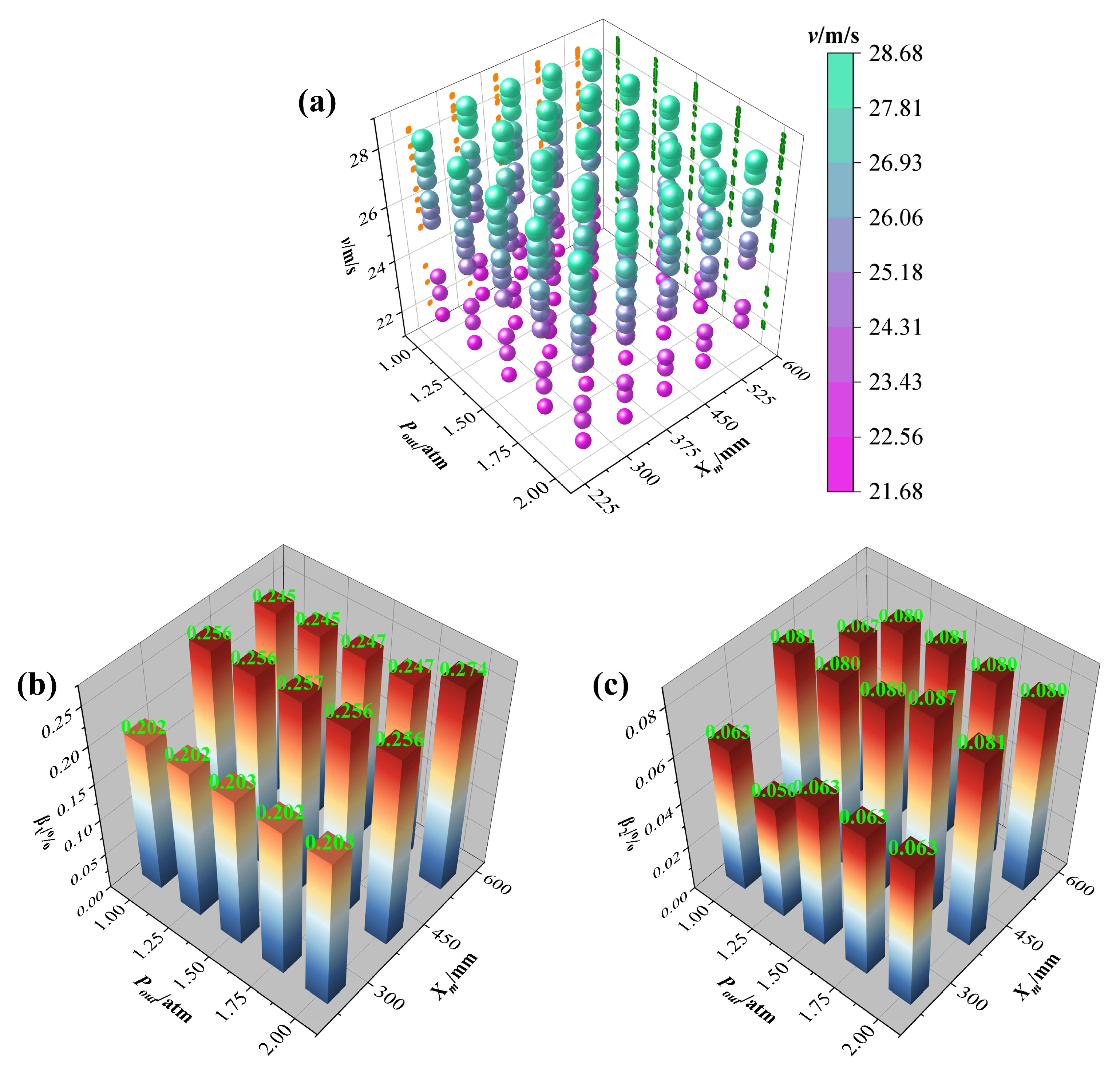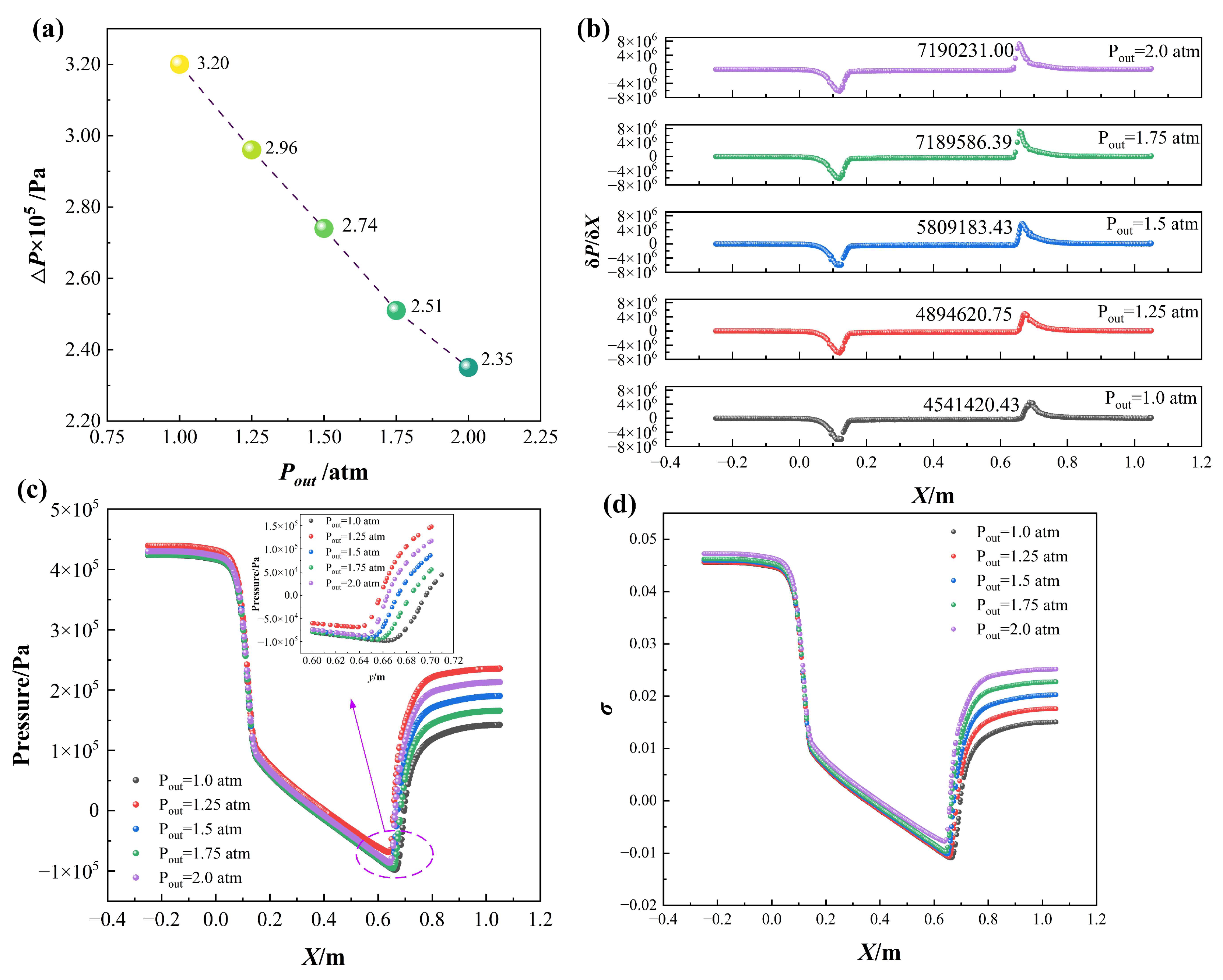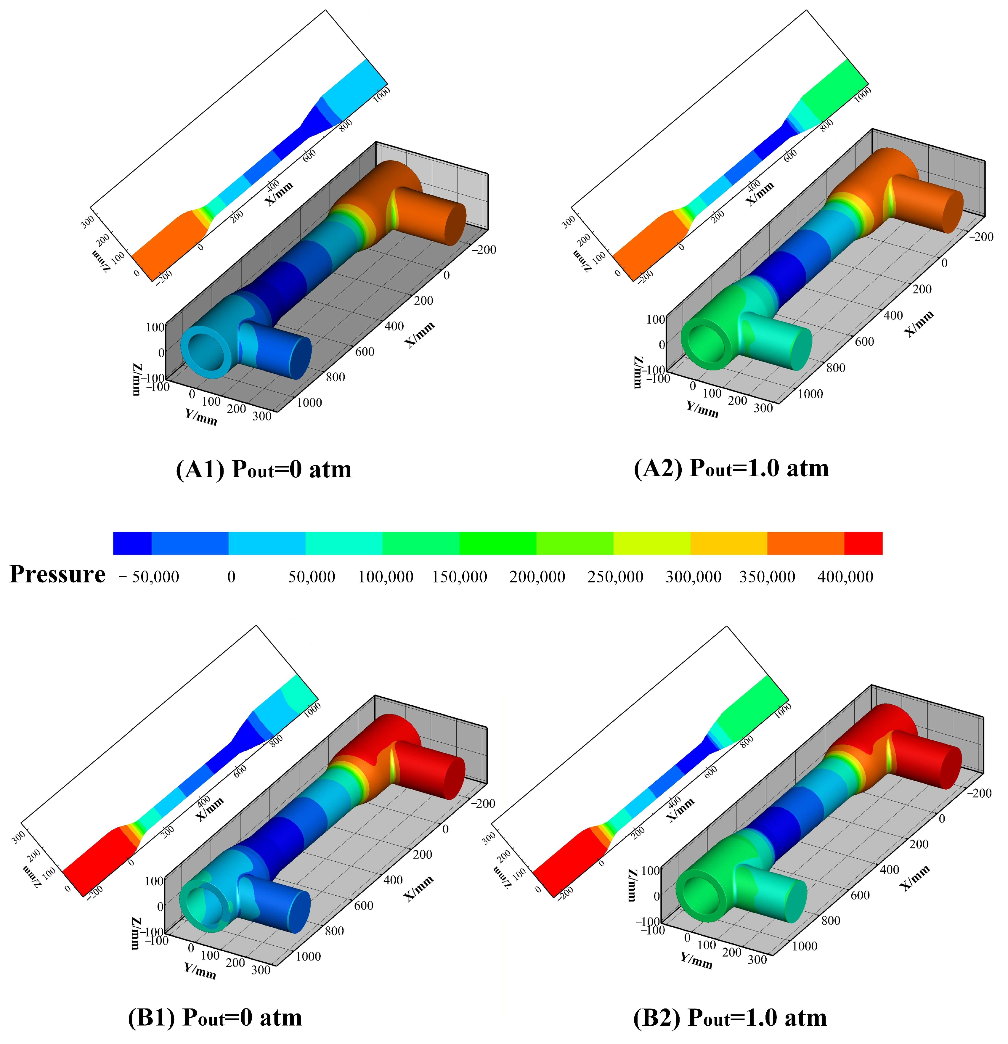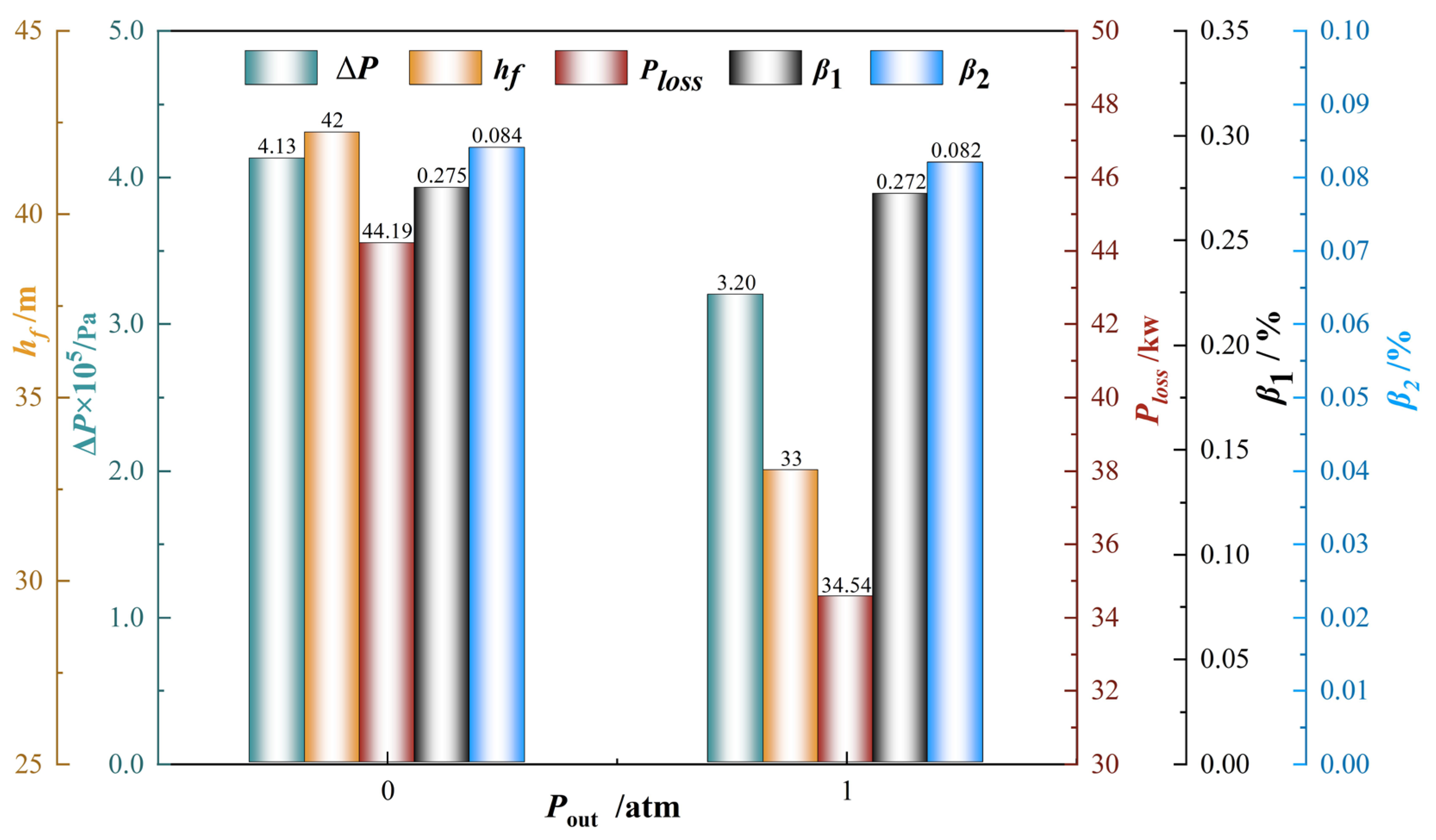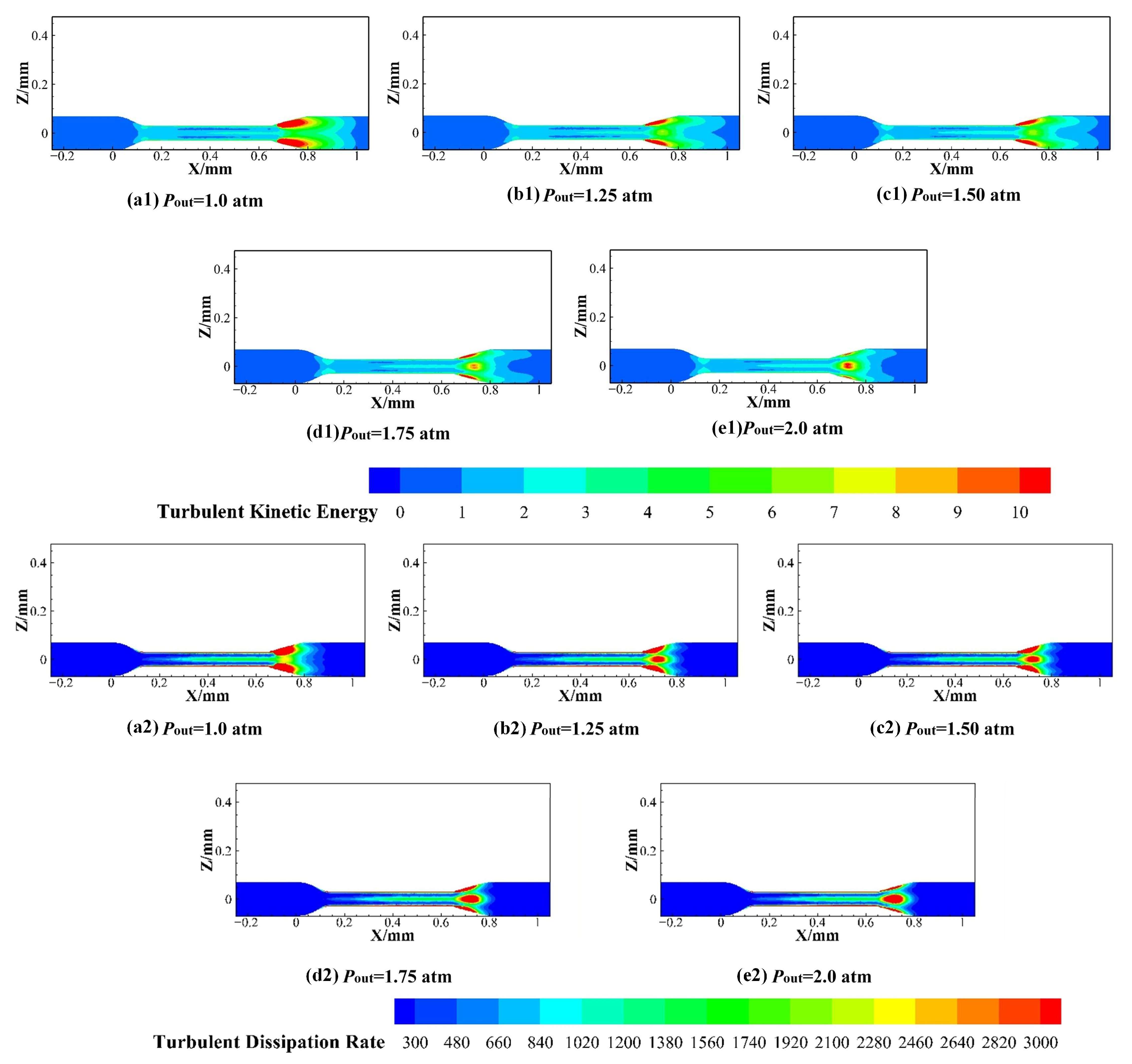 - As the outlet gauge pressure increases from 1.0 atm to 2.0 atm, the flow characteristics are significantly optimized: the pressure loss is reduced by 26.6%, the power loss decreases by 27.3%, and the drag coefficient drops by 26.6%. Meanwhile, the flow non-uniformity is controlled within 1%, and the proportion of high-speed flow regions increases to 75%, fully meeting the design requirement of a flow velocity ≥25 m/s. These improvements stem from the systematic regulation of flow mechanisms by the outlet gauge pressure: the elevated static pressure level effectively suppresses cavitation, eliminating the energy dissipation caused by bubble collapse; the stabilized pressure field inhibits boundary layer separation and secondary flows, promoting the migration of turbulence structures toward smaller scales; and the optimized vorticity distribution and wall shear stress field ensure efficient momentum transport. Notably, when the outlet gauge pressure exceeds 1.75 atm, the flow transitions completely from cavitation-dominated to viscous dissipation-dominated, achieving an optimal stable state.