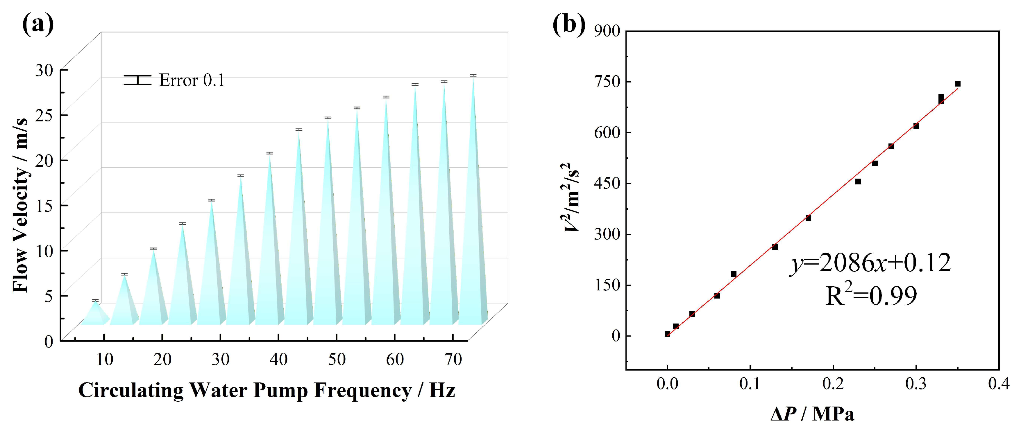 - The experimental results demonstrate stable operation and precise control of the circulating water system, with the flow velocity showing an approximately linear increase with the pump frequency, confirming favorable controllability of the setup and reliability of the experimental data. A strong linear correlation between the pressure differential and the square of the flow velocity aligns with the dynamic pressure principle described by the Bernoulli equation, indicating stable flow and effective energy conservation within the test section. As the outlet gauge pressure increases, the system pressure drop gradually rises, contributing to enhanced flow stability and improved heat dissipation uniformity, thereby further optimizing the overall system performance. These experimental findings are in mutual agreement with the numerical simulation results presented earlier, validating the reliability and accuracy of the model predictions.