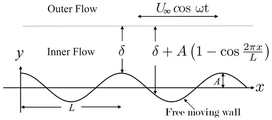 which must satisfy both the matching condition for the streamwise velocity with the outer flow outside the boundary layer and the interaction with the free-moving wavy solid wall. At the free-moving wavy wall, the fluid is required to satisfy the no-slip boundary condition. Therefore, the boundary conditions that Equations (13) and (14) must satisfy are the following: