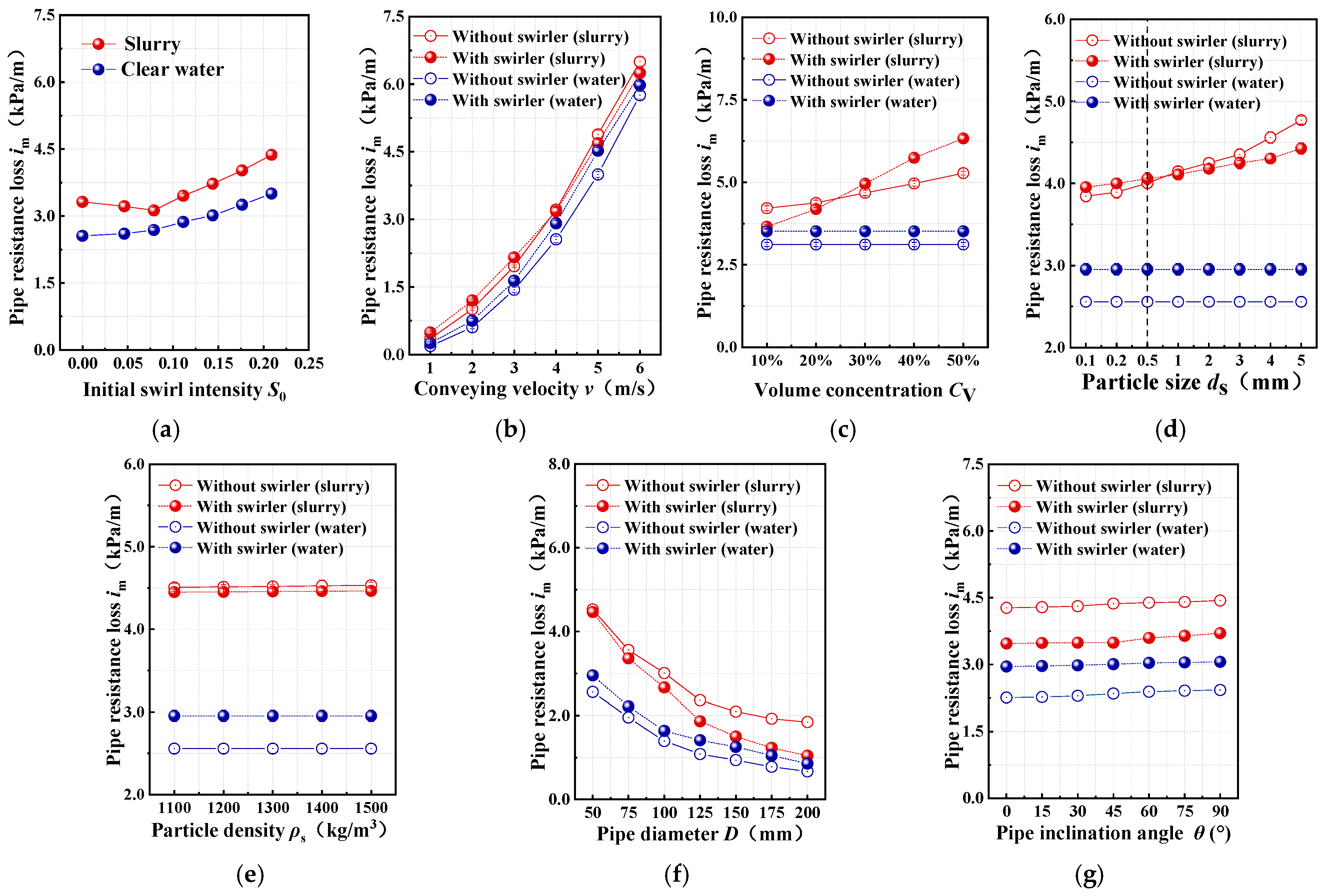 - Under the action of the swirler, the slurry resistance loss first decreases and then increases with the increase in the swirling intensity. It increases with the increase in conveying velocity, volume concentration, particle diameter, particle density, and pipe inclination angle, and decreases with the increase in pipe diameter. Only under the conditions where the conveying velocity exceeds 4 m/s, the particle diameter is larger than 0.5 mm, and the volume concentration remains below 25%, does the pressure loss become lower than that without the swirler.
