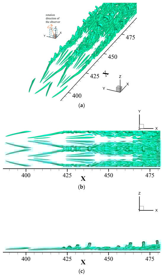 Figure 3b, the top view of the vortex structures is presented, showing that in the early stage of the flow transition, the vortex structures still remain symmetrical.