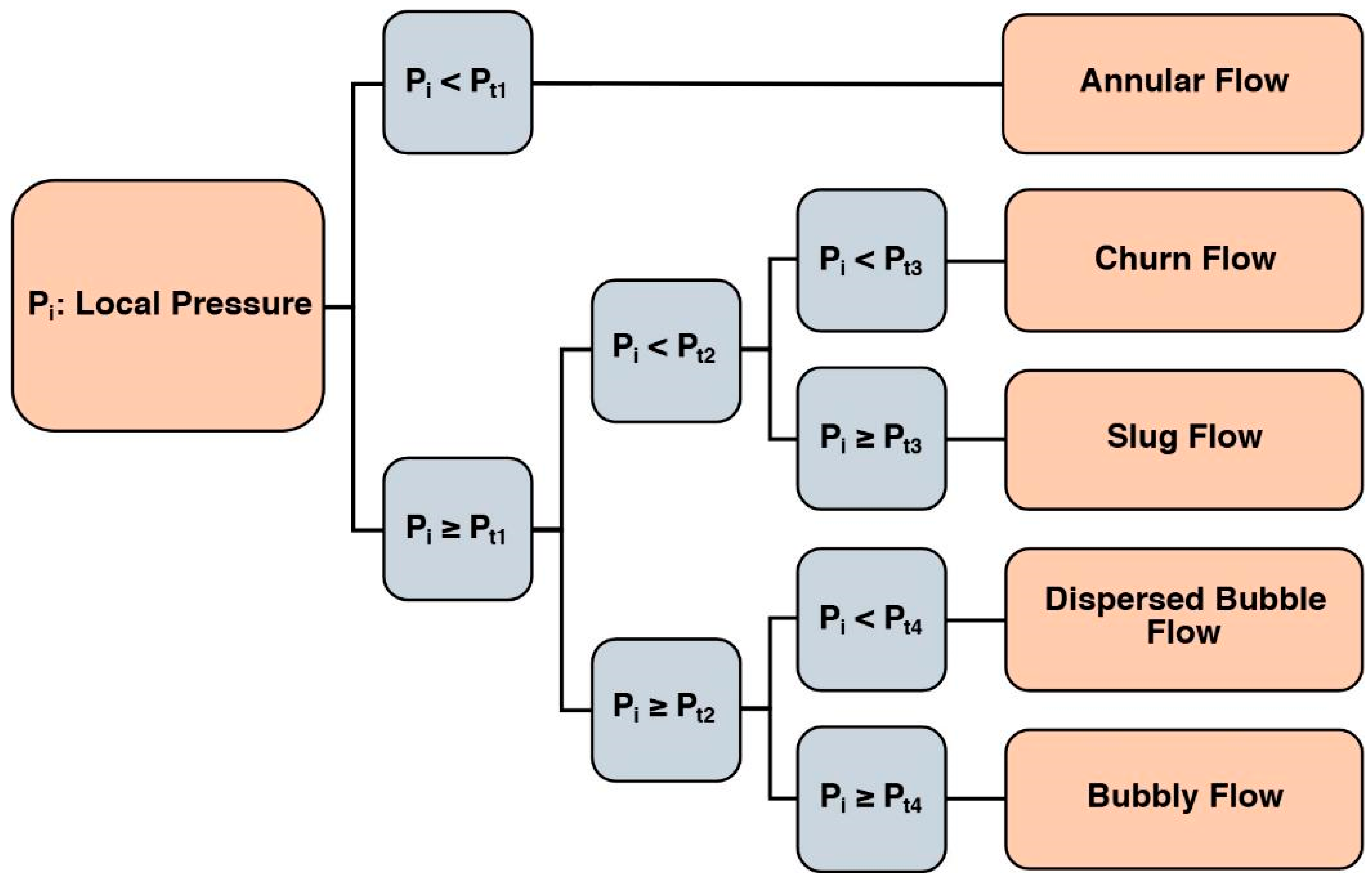 27]. Conversely, some annular flow models are inappropriate for dispersed flows. This dependency necessitates a priori knowledge of the flow pattern to select the appropriate correlation, which is a practical limitation, as the flow pattern itself is an outcome of the flow conditions. There were several attempts to create full-range correlations aimed to overcome this issue by providing continuous functions across all regimes, but they often rely on extensive curve fitting, which can sometimes obscure the underlying physics [