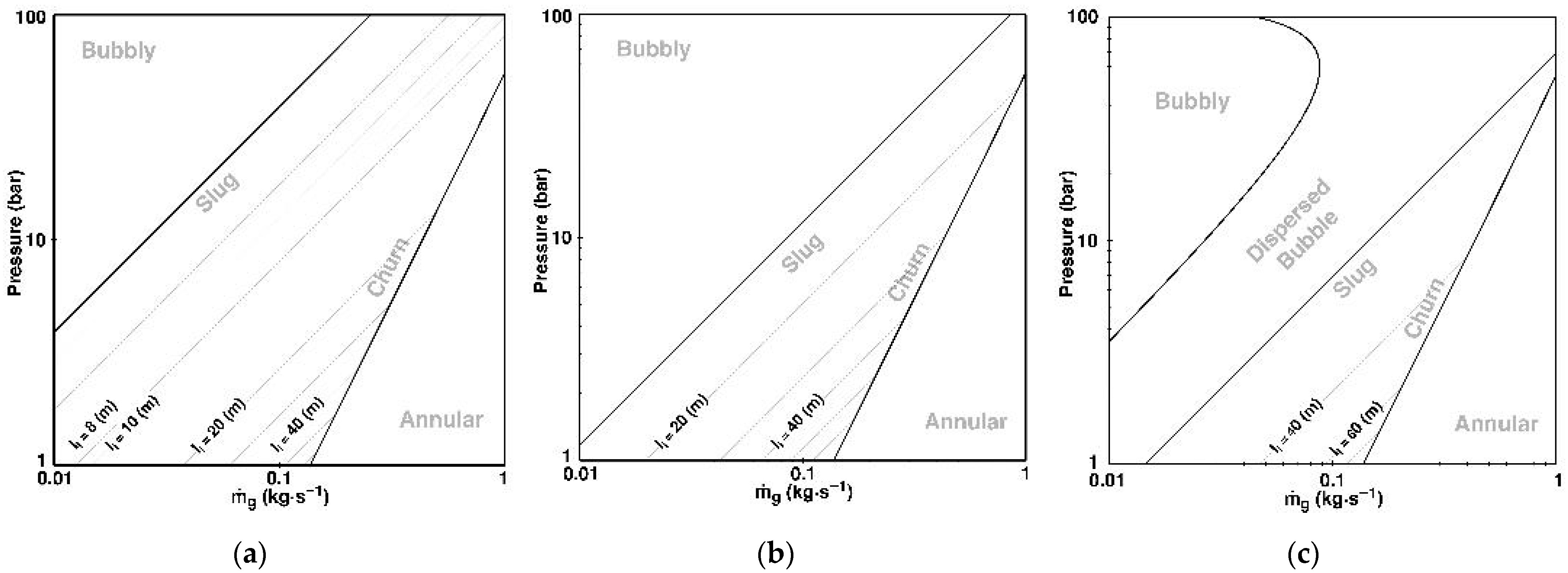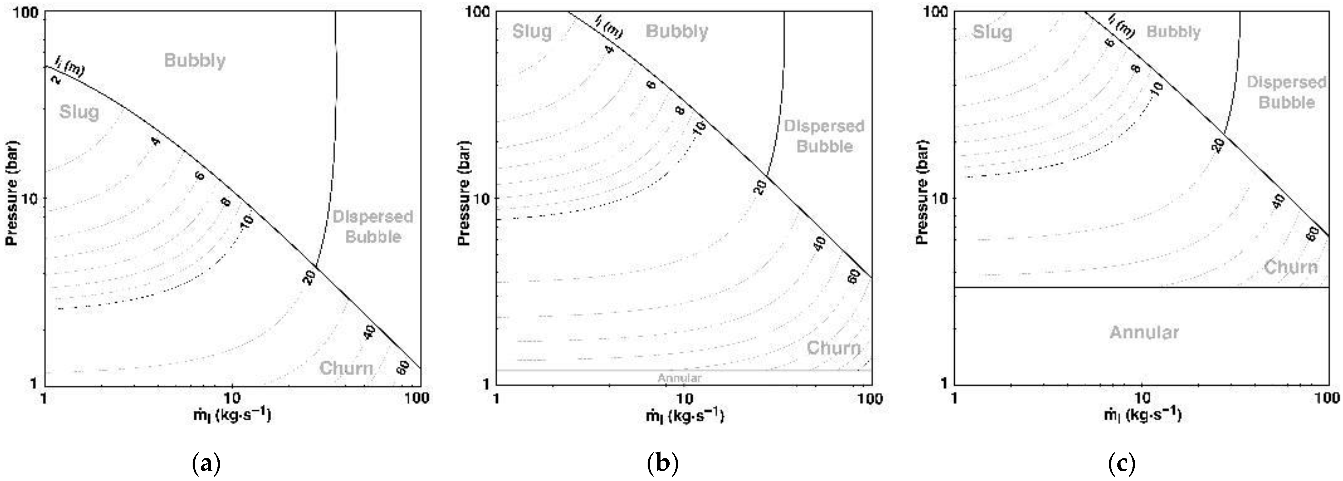 In Equation (35), is the pressure in which transition can happen, and , , and are constants depending on the flow pattern. is a function of fluid properties and flow pattern. is a small positive value considered to ensure non-negative values that may happen for the calculation of churning criteria at distances close to the inlet. The value of will be directly correlated with temperature and compressibility of gas; in the case of considering gas as ideal, it would only be a function of temperature. Further simplification can be performed by considering the system as an isotherm with no temperature variations alongside the flow path, which will result in constant . Flow patterns can be approximated by transforming the criteria used to develop flow pattern maps, and by comparing system pressure at the point of interest with these criteria, flow patterns can be found.