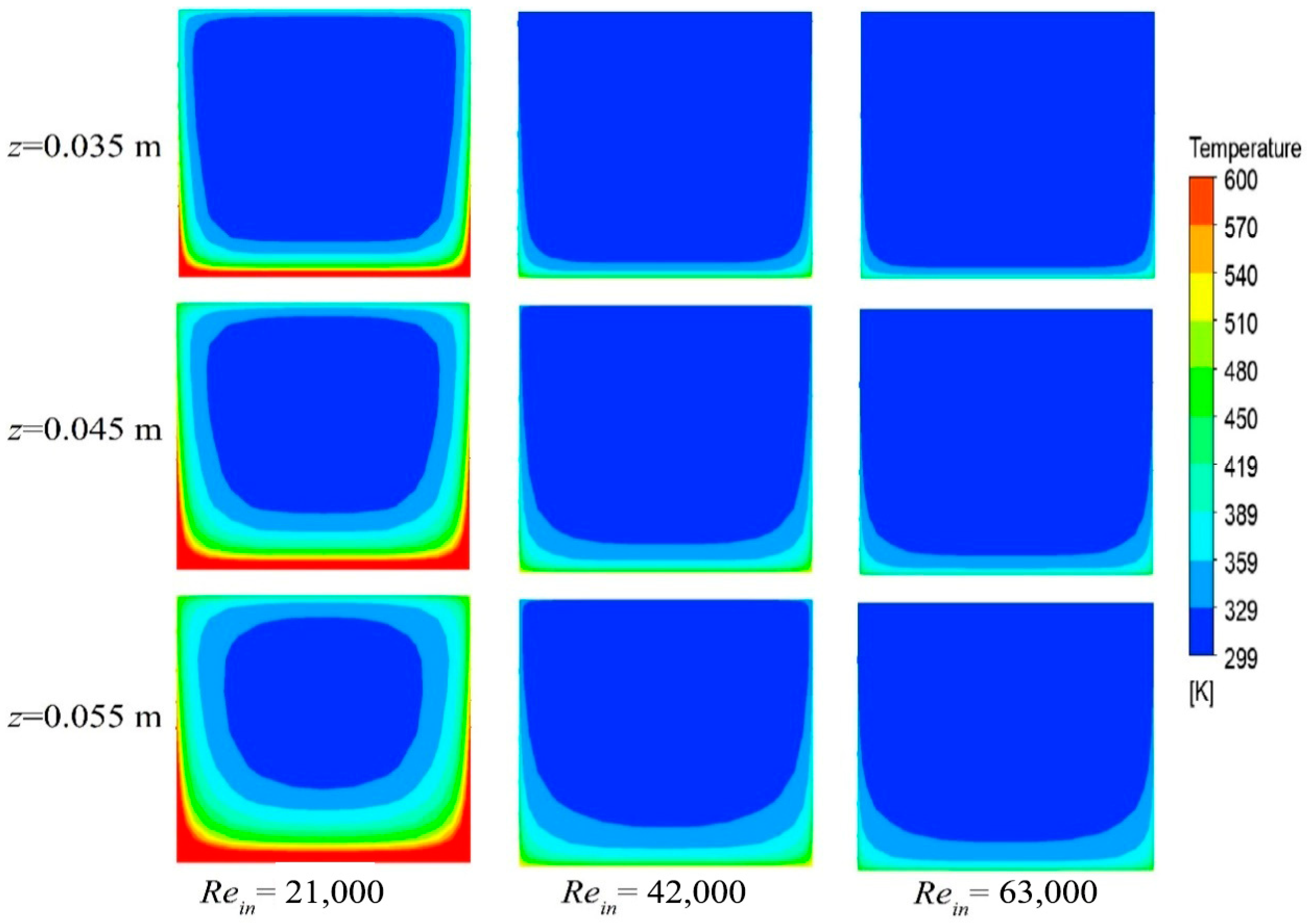 Figure 9 present the temperature distributions and velocity profiles, respectively, across three cross-sections along the channel length for Reynolds numbers of 21,000, 42,000, and 63,000. As the Reynolds number increases, the flow transitions from a laminar to a turbulent regime. Turbulent flow is characterized by enhanced mixing between coolant layers, which significantly improves heat transmission to the cooling fluid from the heated surface. This is evident in