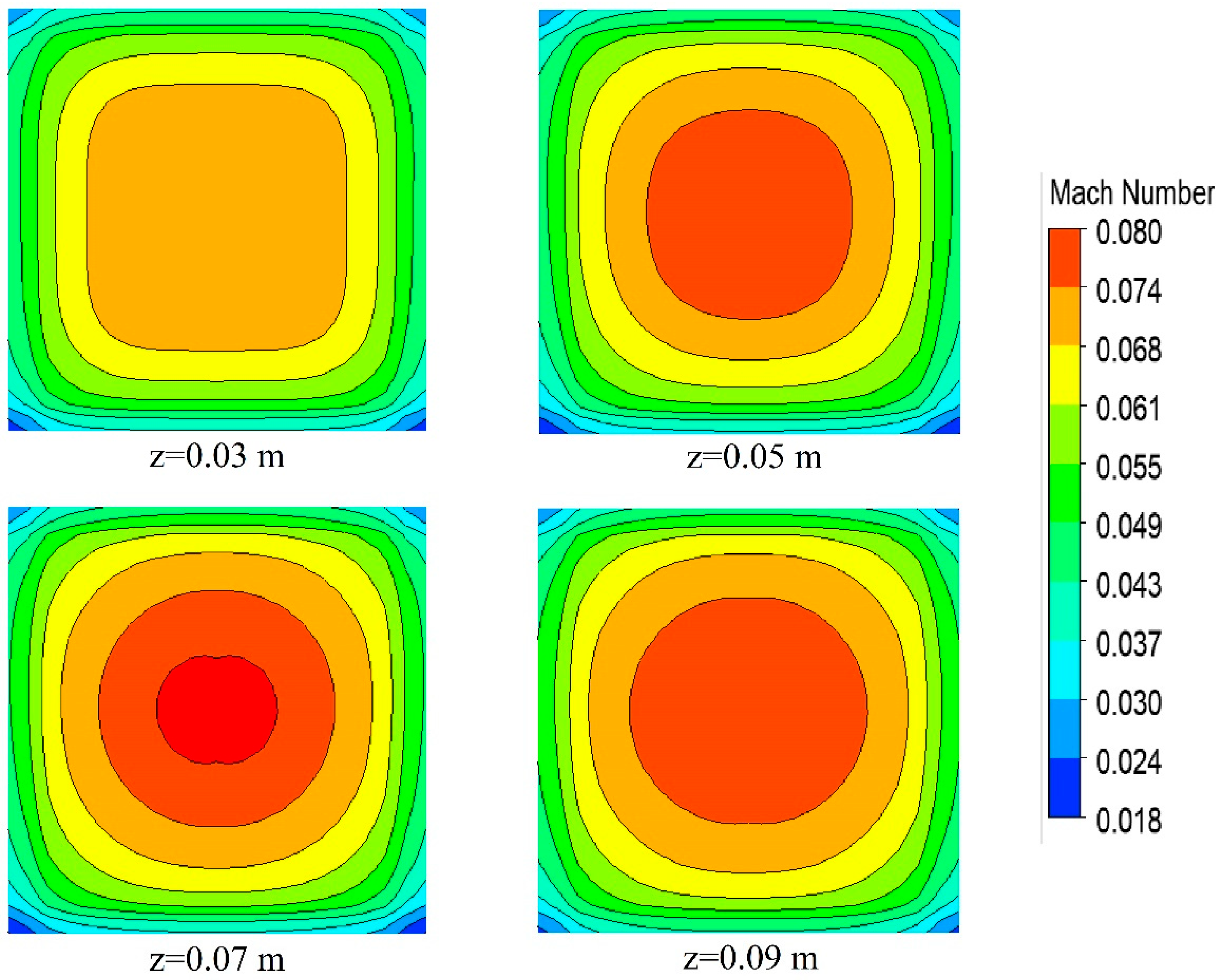 Figure 11 presents contours of the local Mach number at four streamwise locations (z = 0.03, 0.05, 0.07, and 0.09 m). The results confirm that the Mach number remains below 0.08 throughout the heated section of the channel. This firmly establishes that the flow is within the low-Mach-number regime, where aerodynamic compressibility is negligible. The primary driver of the observed strong density variations is therefore thermal expansion, which is fully captured by the real gas equation of state, rather than fluid dynamic compression. This justifies the use of the pressure-based solver without additional compressibility corrections in the turbulence model.