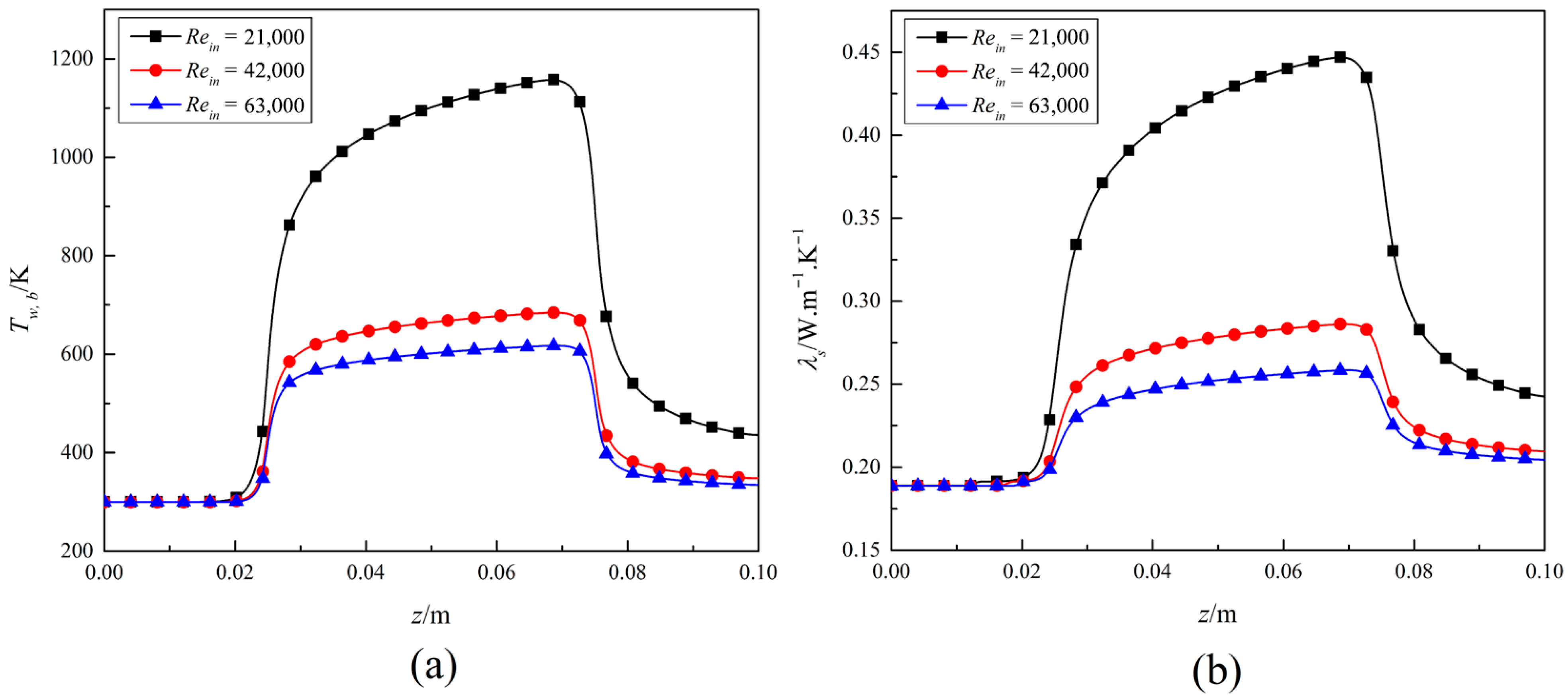 Figure 12b corroborates this discovery, demonstrating enhanced thermal conductivity with increasing Re, especially at high values of z. Collectively, these findings indicate that increased Reynolds numbers enhance the effectiveness of heat transfer by lowering wall temperatures and improving thermal conductivity, which is essential for preventing localized hot spots and achieving uniform cooling performance in applications such as regenerative cooling systems. Although higher Reynolds numbers enhance heat transmission and flow uniformity, they can cause flow instabilities. These instabilities, such as flow separation, recirculation zones, and pressure fluctuations, might have a negative impact on the cooling system’s performance. For instance, flow separation can lead to the formation of stagnant regions where heat transfer is significantly reduced, while pressure fluctuations can cause mechanical vibrations and fatigue in the cooling channel walls. Therefore, it is crucial to evaluate the flow behavior across a range of Reynolds numbers to identify the optimal operating conditions that ensure stable and effective cooling without compromising system integrity.