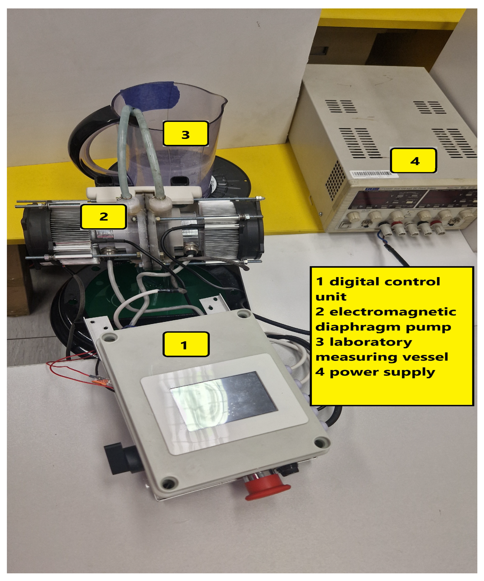 This study examined how temperature, electrical current, flow rate of the pumped liquid, and the switching frequency of the permanent magnet—factors that directly influence pump speed—affect the volume of liquid delivered over time. Consequently, the experimental setup included a digital Sanwa 5000 multimeter (SANWA ELECTRIC INSTRUMENT CO., LTD. Dempa Bldg, Sotokanda2-Chome Chiyoda-Ku, Tokyo, Japan), a container, a laboratory power supply, a funnel with laboratory glassware, an electromagnetic diaphragm pump, a digital control unit, and a thermal imaging camera (see