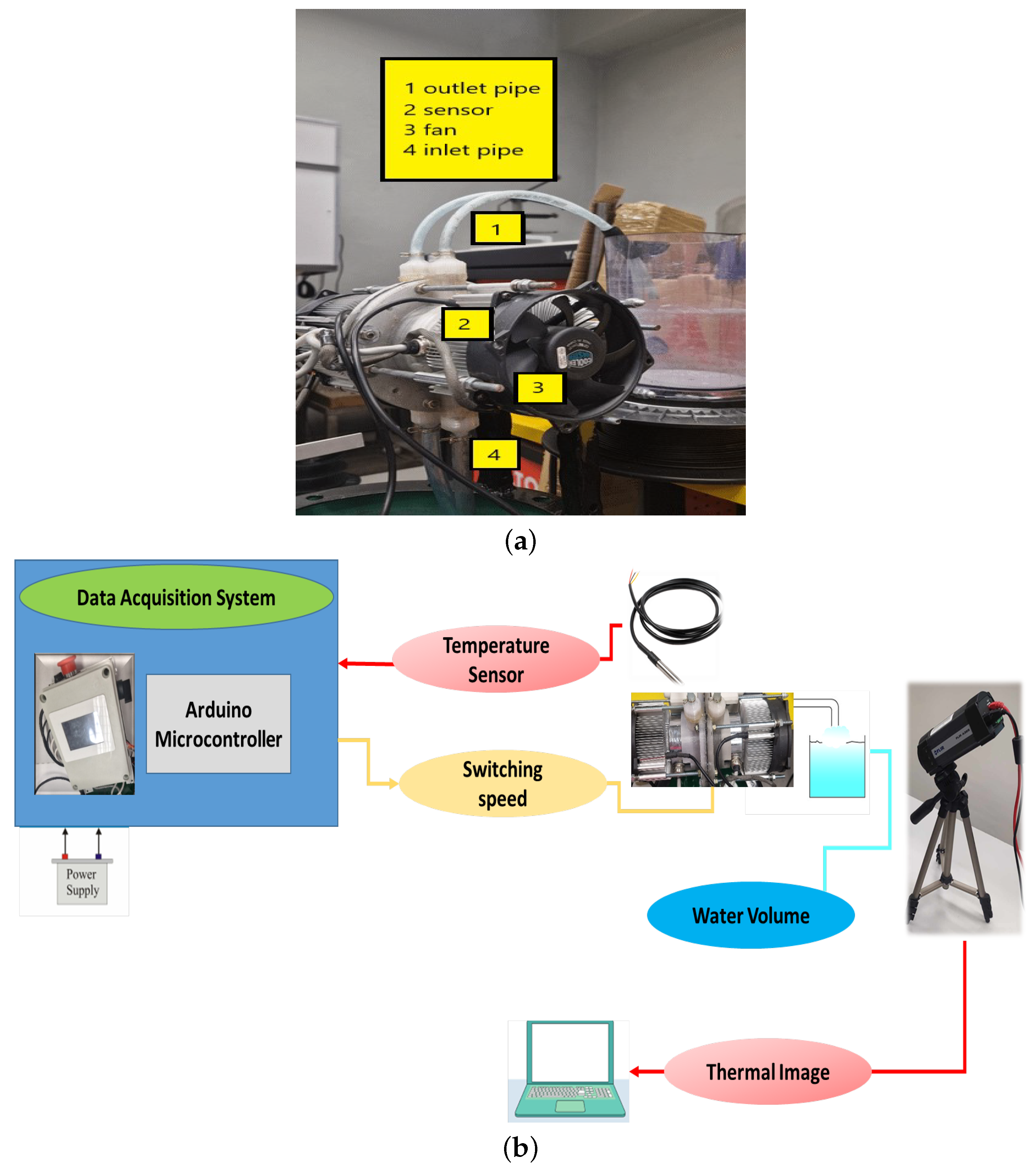 Figure 3b shows the acquisition and control system in the electromagnetic device to produce signals such as the temperature. Both the radiator and its cooling fan were positioned adjacent to each electromagnet.