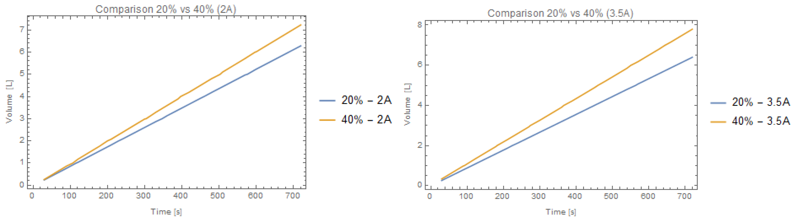 Figure 8 compares the cumulative volume of liquid pumped over time. The 40% switching speed delivers a greater volume than the 20% case for the same supply current. This effect becomes more pronounced at higher current (3.5 A).