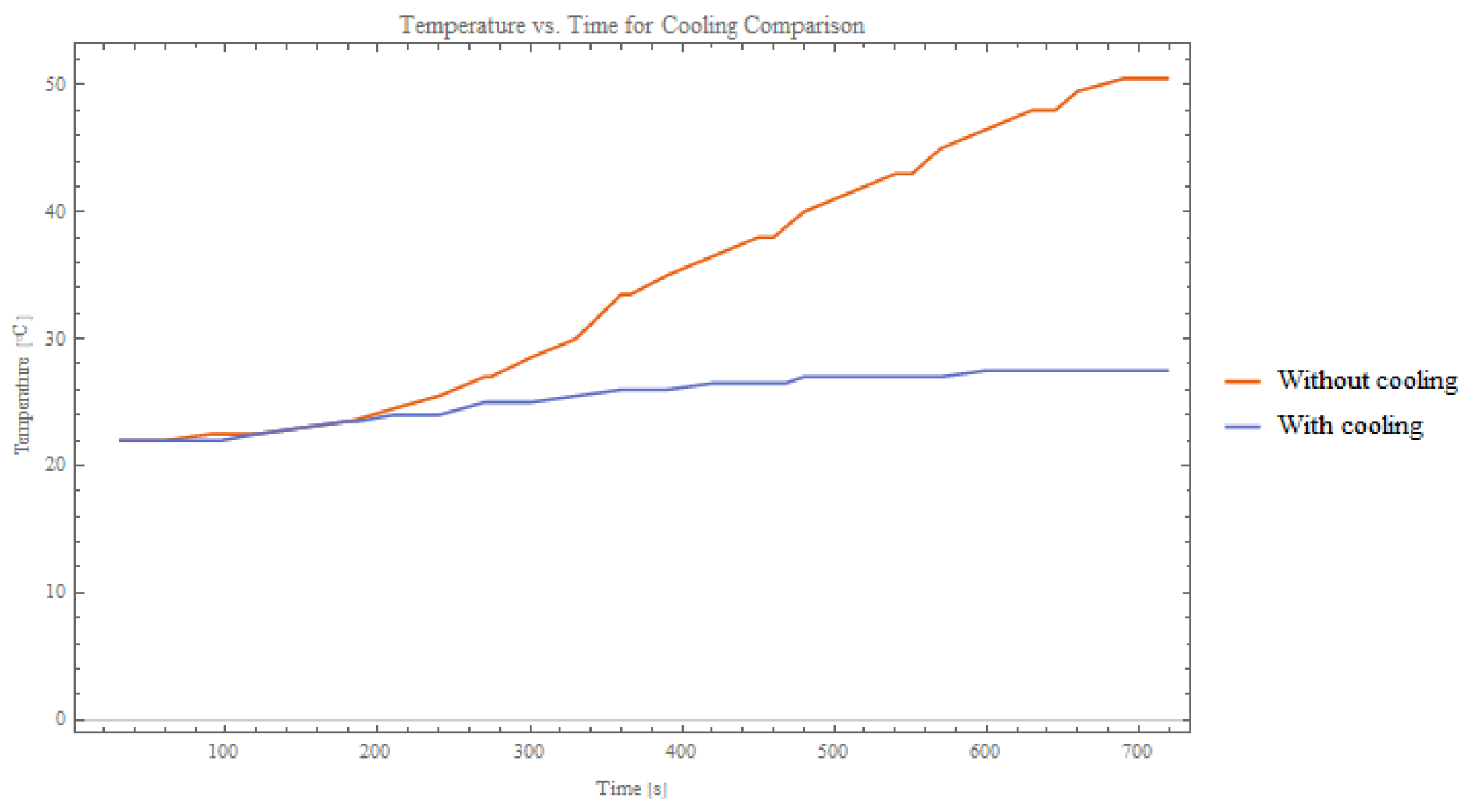 The cooling system uses a fan to actively remove excess heat and maintain a target temperature around 27 °C, as observed in the temperature comparison with vs. without the cooling system for a 40 % switching speed and pump current of 3.5 A in