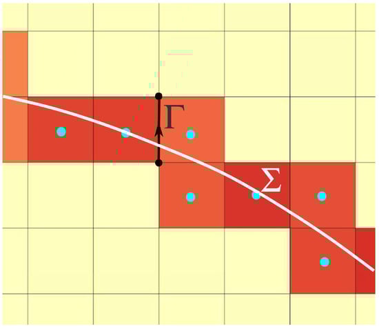 From a practical point of view, the procedure consists of initializing the capillary energy on the primal and dual geometric structures from located on the segments . The material derivative of this can be broken down into two accelerations: the gradient of the scalar potential and the dual curl of the capillary energy located on the facets. Figure 2 schematizes the deposition of the capillary vector energy at the initial instant on the segments of the primitive structure cut by the interface . The scalar potential is none other than the pressure difference on either side of the interface. Since the fluids are non-viscous, the local rotation is due solely to the rotation generated by capillary effects; this is localized in the two cells with a common edge crossed by the interface. The rotation in the other cells of the physical domain is strictly zero. The capillary acceleration modifies the velocity of the fluid at each instant and therefore the celerity of the interface.