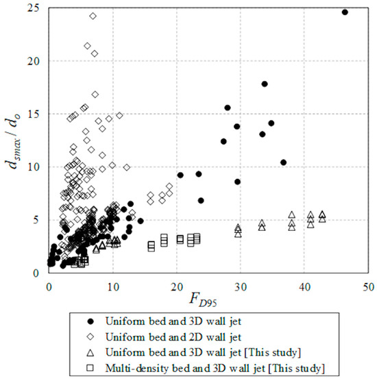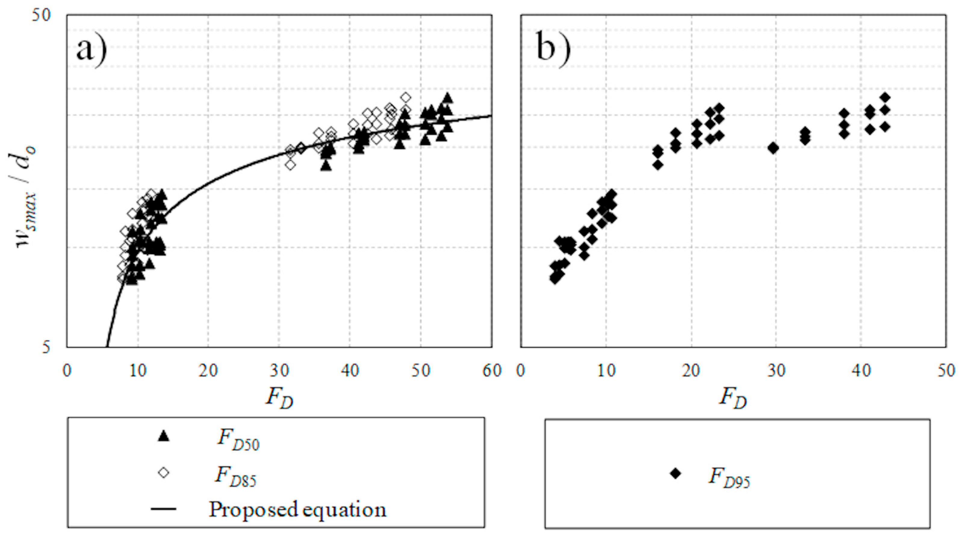 - A densimetric Froude number based on D95 can properly describe the correlation between flow intensity and maximum scour in a multi-grain size and density bed. Two linear models were proposed to describe the correlation between normalized peak scour depth and densimetric Froude number with a threshold value of FD95 = 12.