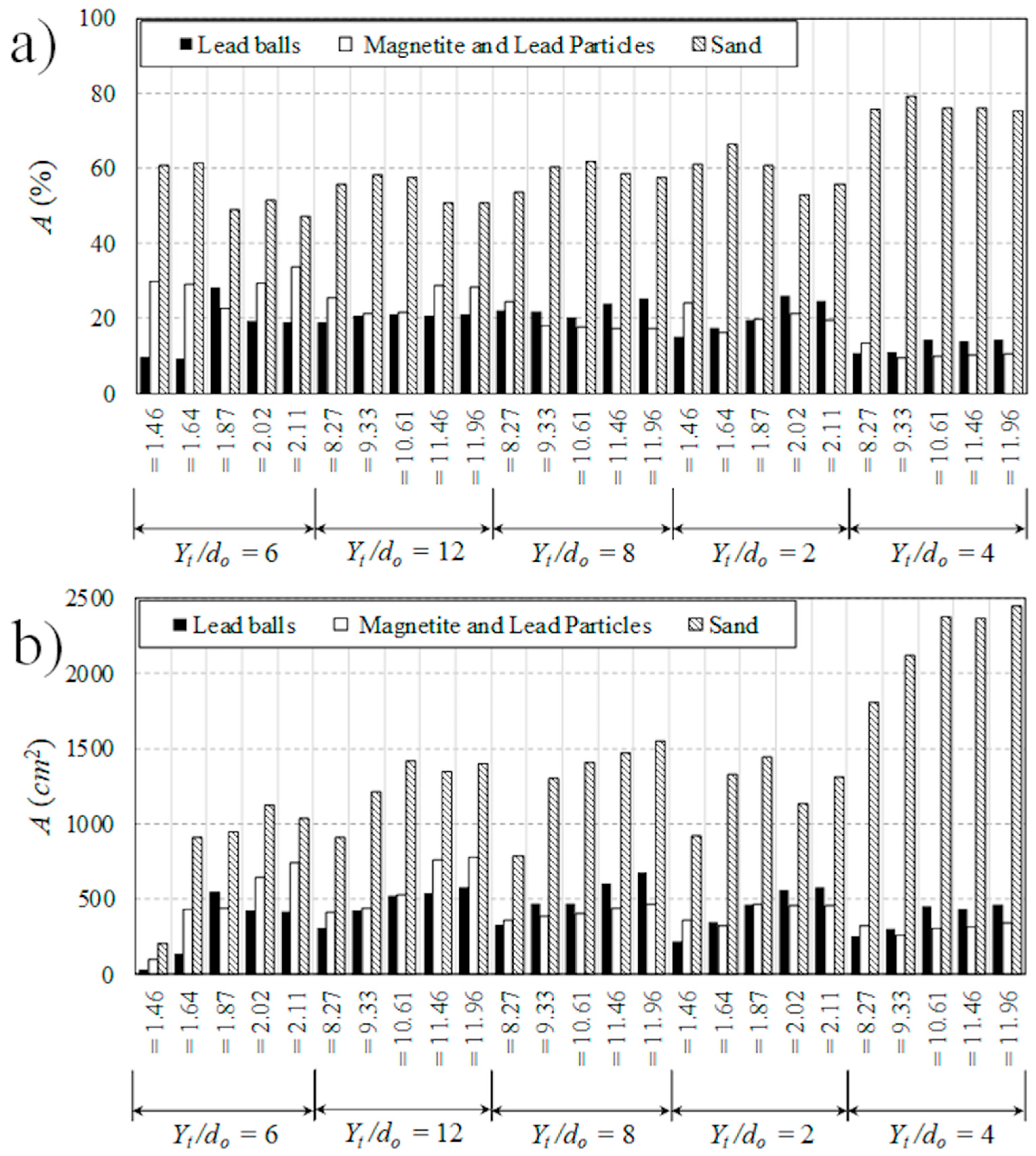 - The effect of submergence in suppressing jet diffusion was evident in variations of lead and magnetite particles. In lower tailwater depths, the area covered by the lead and magnetite particles reduced due to jet diffusion. Therefore, the highest area of lead and magnetite particles occurred in deeply submerged flow conditions. The jet in shallow submergence was diffused predominantly at the water surface and did not penetrate efficiently towards the bed. Therefore, the area of sand particles was found to be higher in the presence of low submergence.