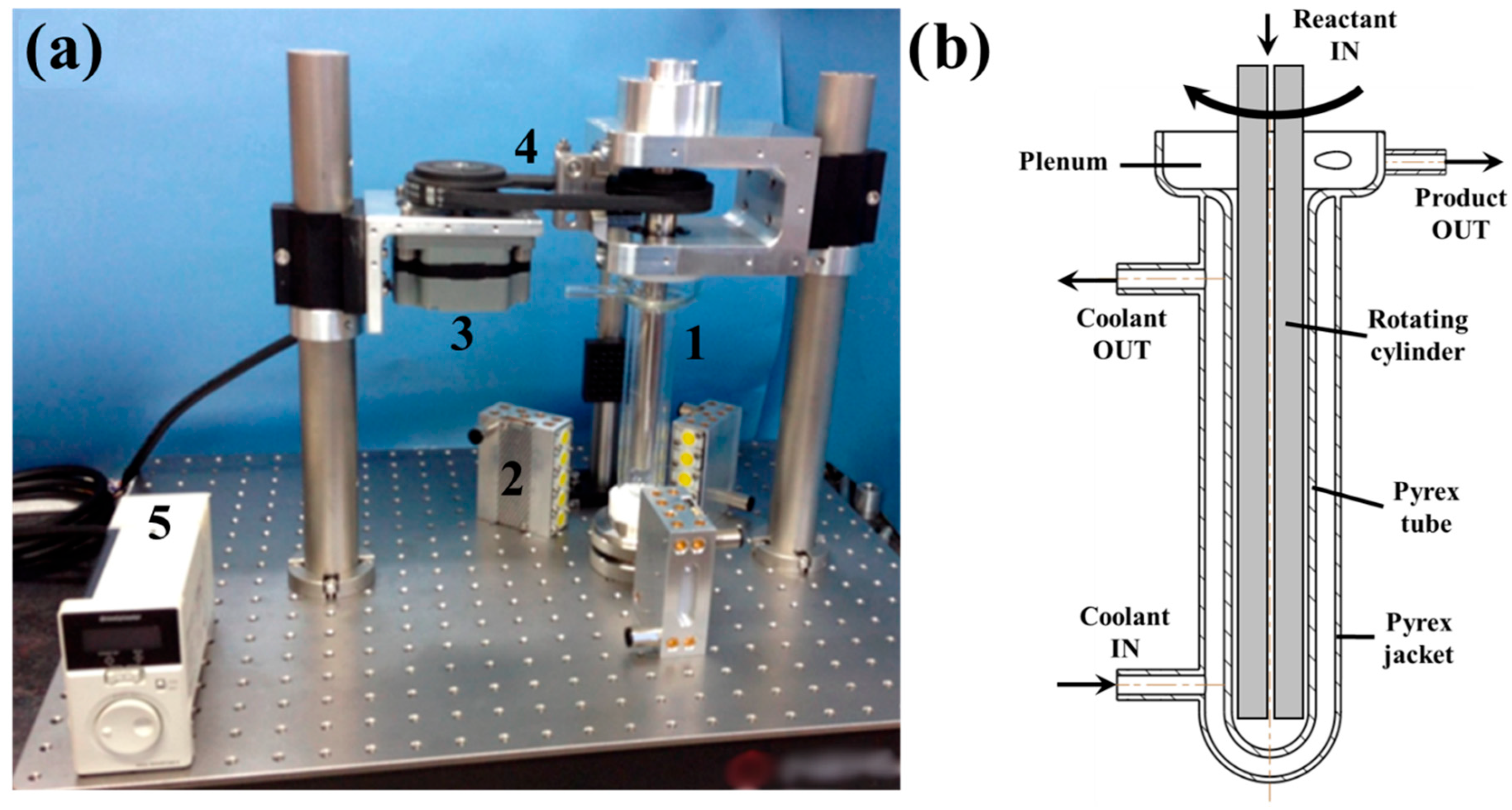 - Lee, D.S.; Sharabi, M.; Jefferson-Loveday, R.; Pickering, S.J.; Poliakoff, M.; George, M.W. Scalable continuous vortex reactor for gram to kilo scale for UV and visible photochemistry. Org. Process Res. Dev. 2020, 24, 201–206. [Google Scholar] [CrossRef]