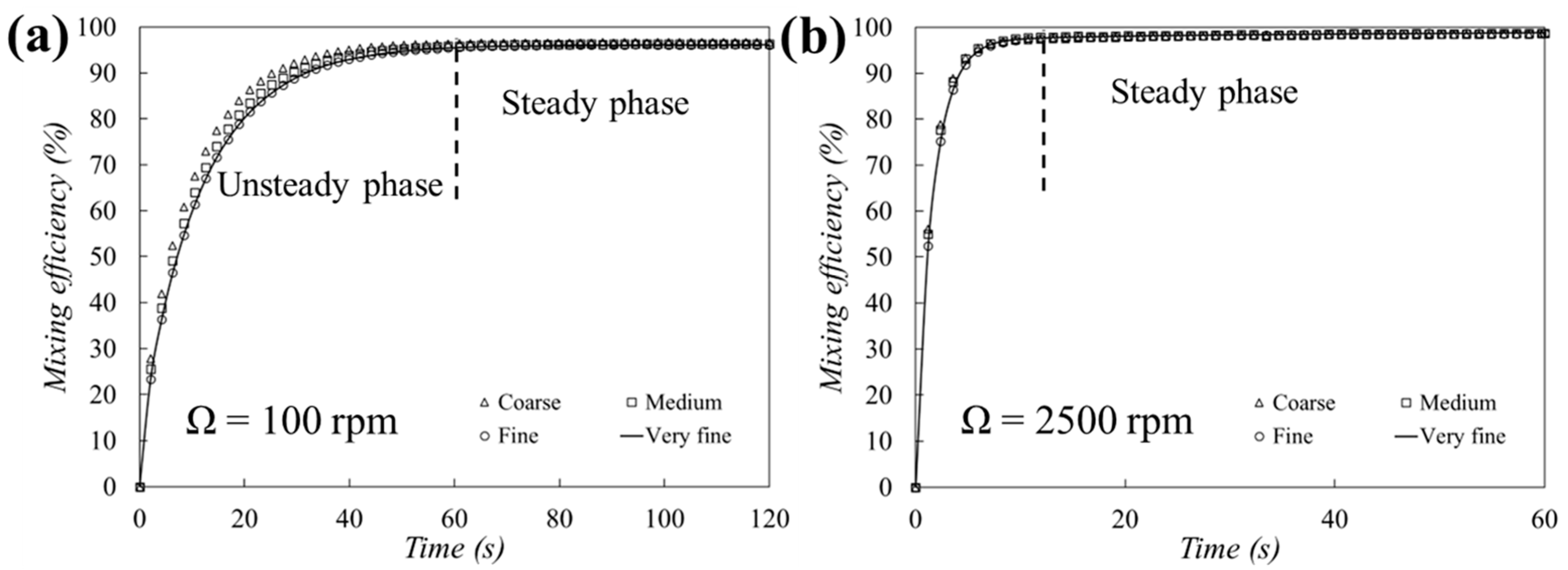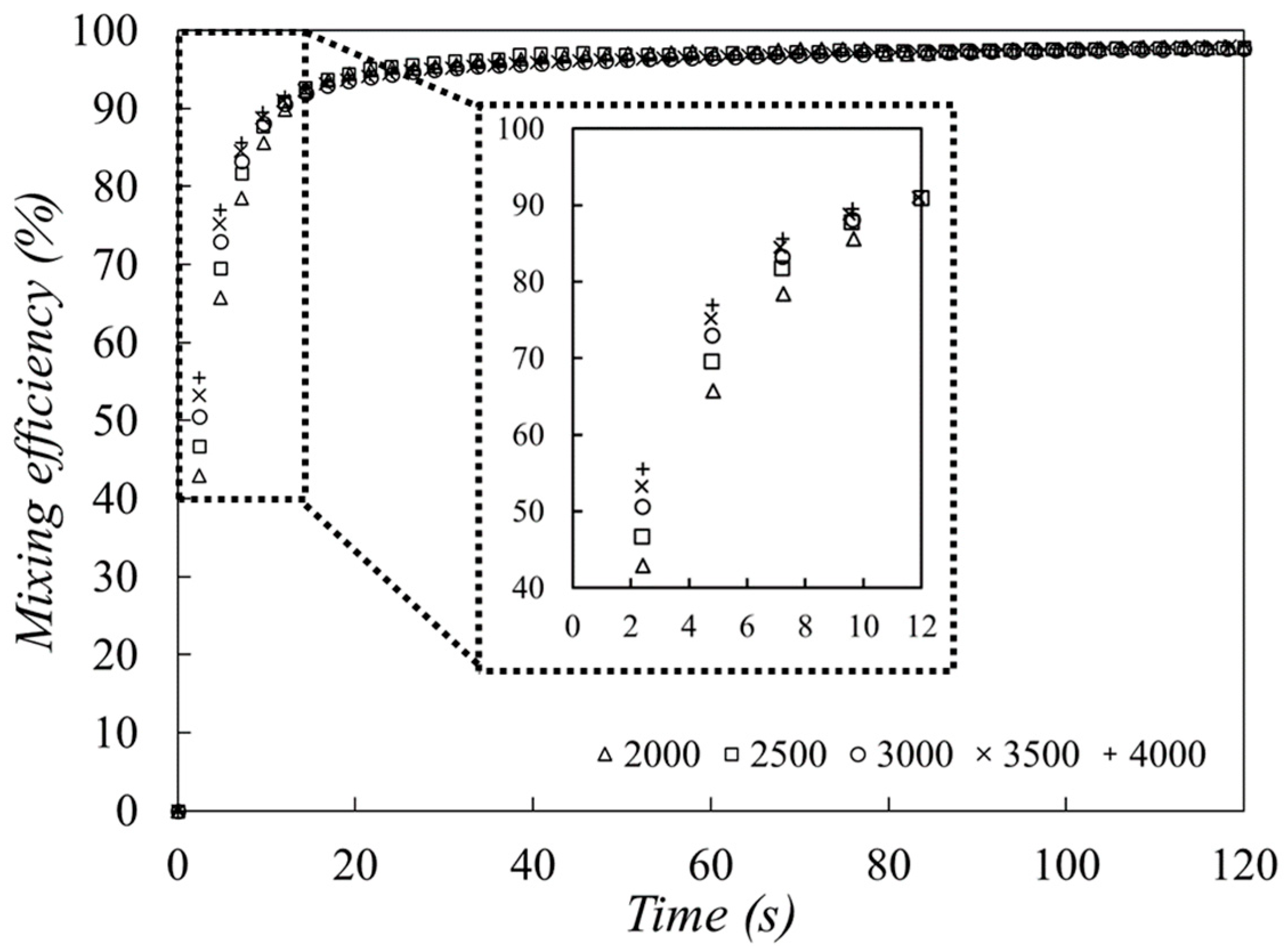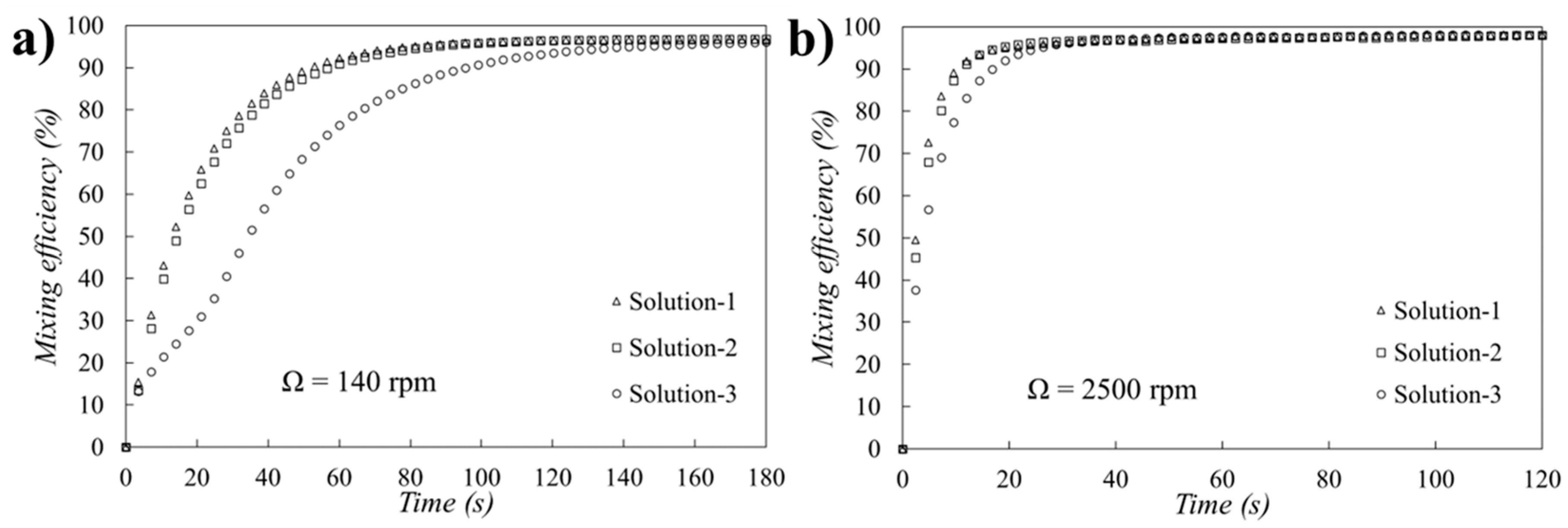 4.4. Effect of the Rotational Speed on the Mixing Efficiency