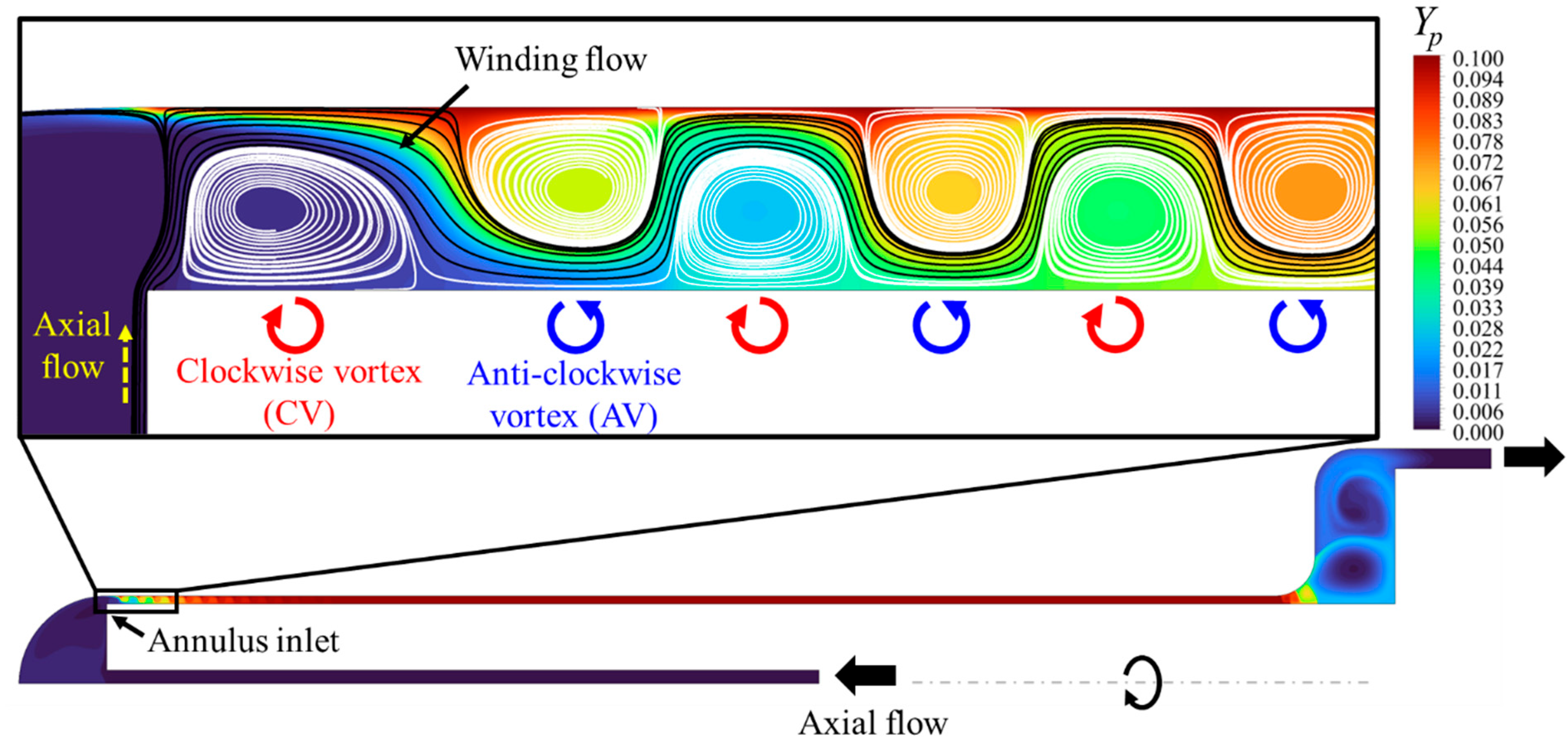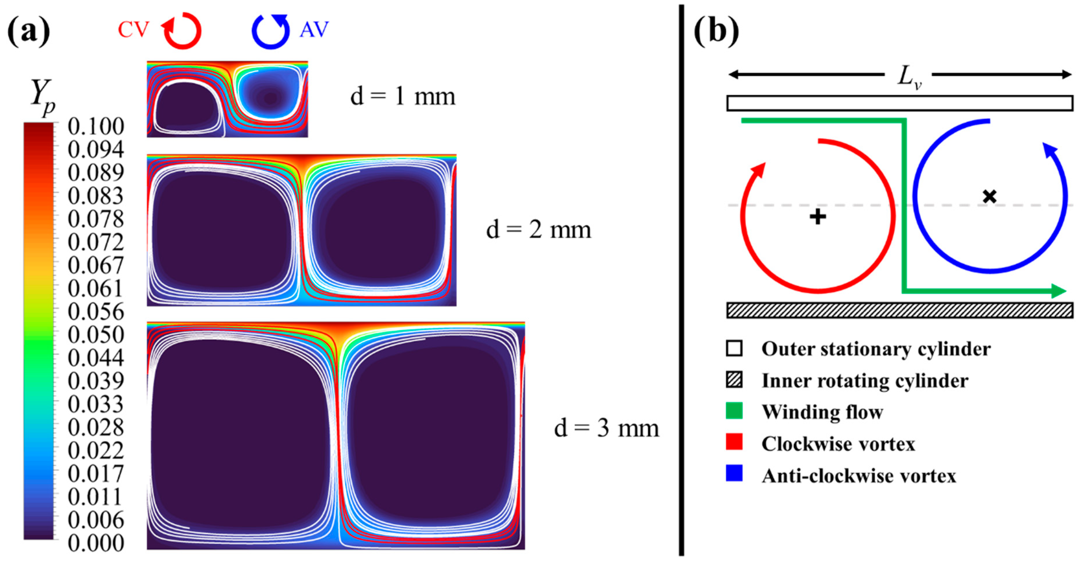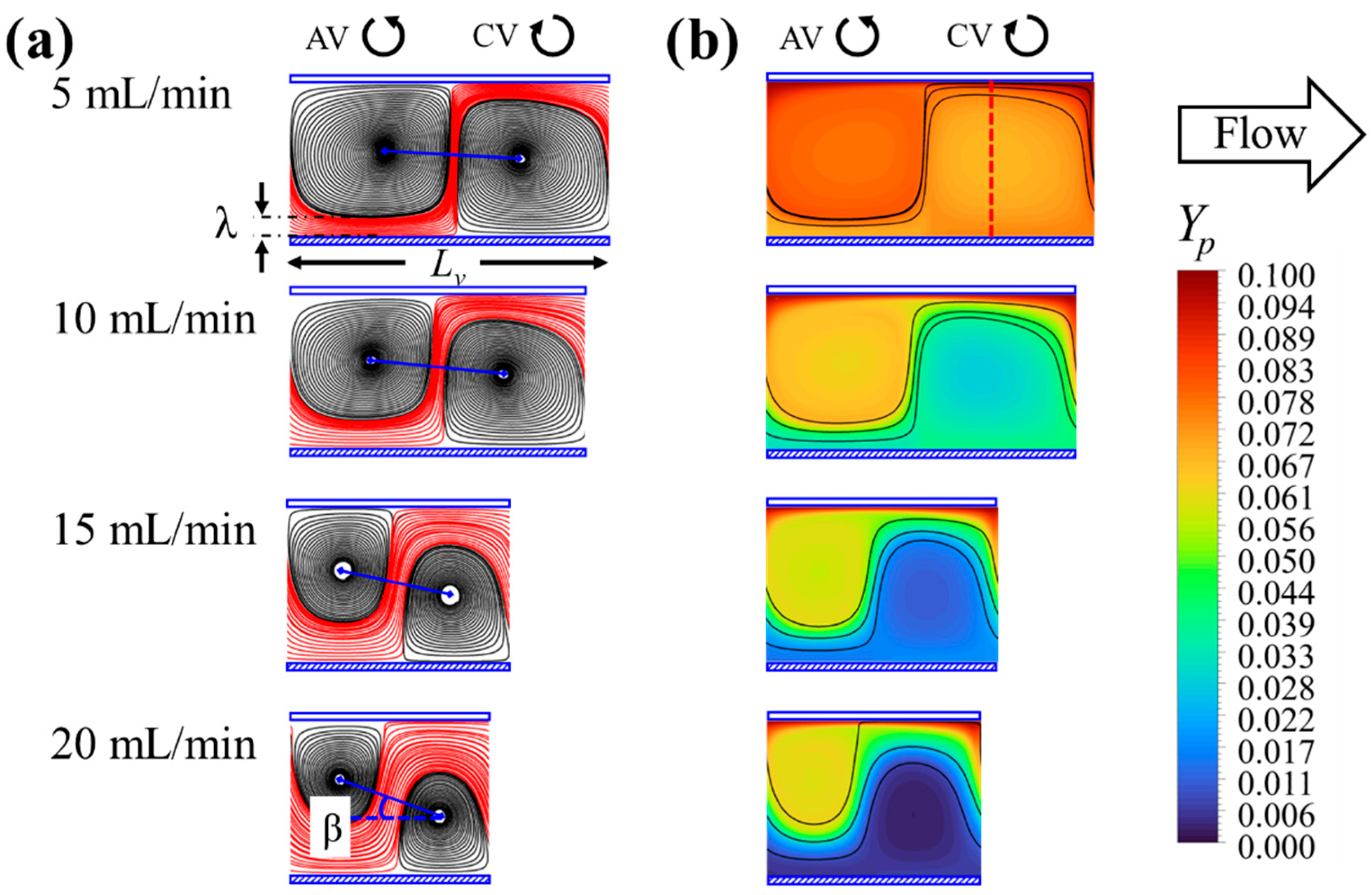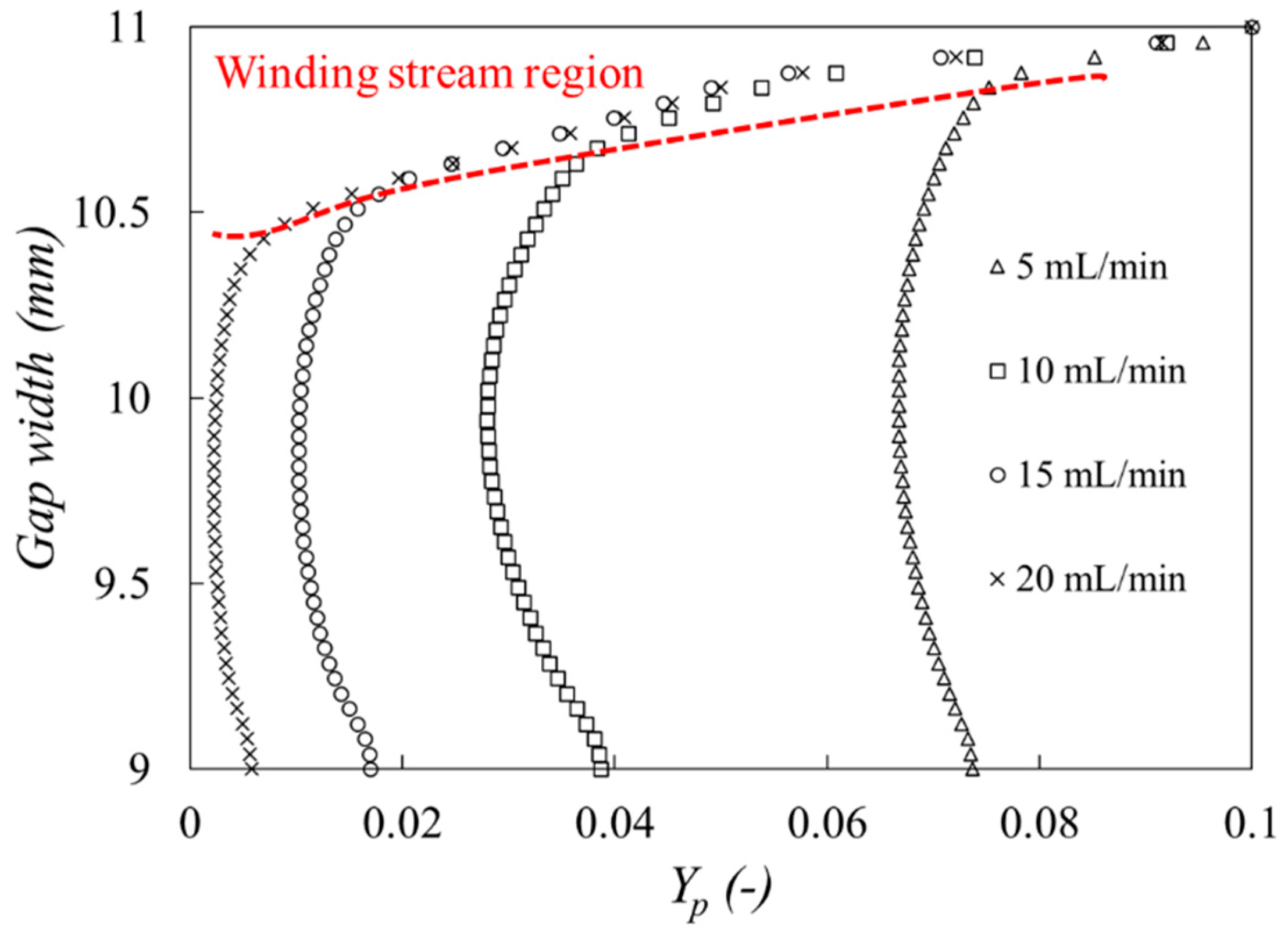 4.3. Effect of the Gap Width on the Flow Structure and Product Distribution