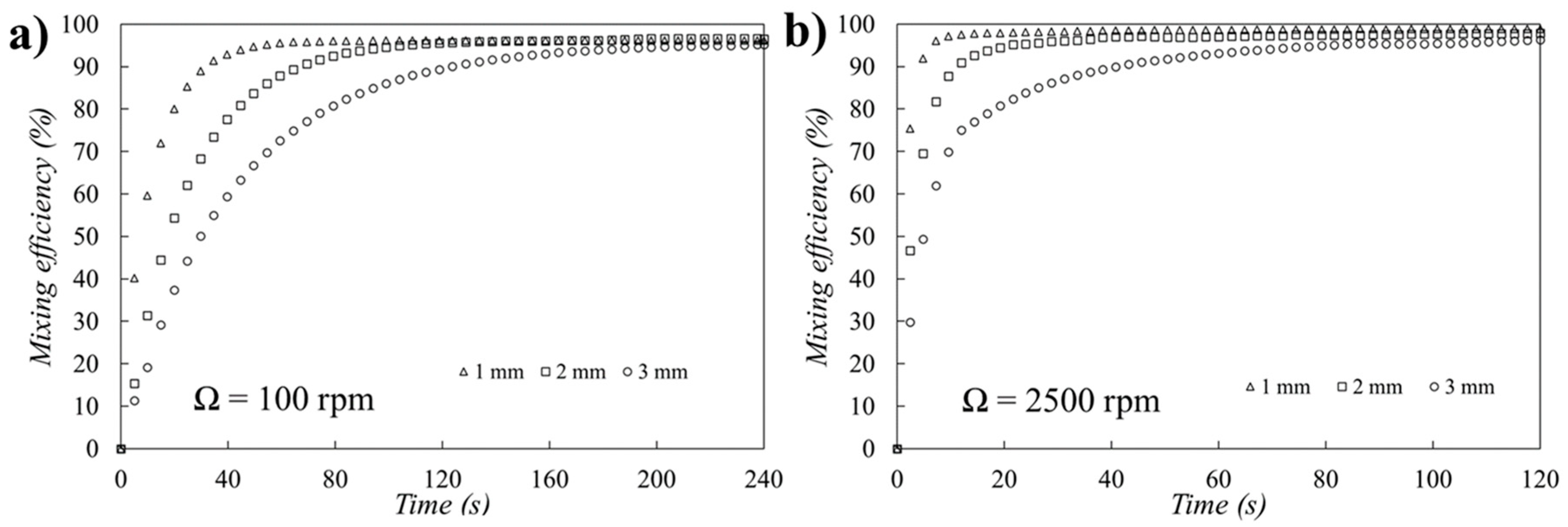 4.2. Effect of the Gap Size on the Mixing Efficiency