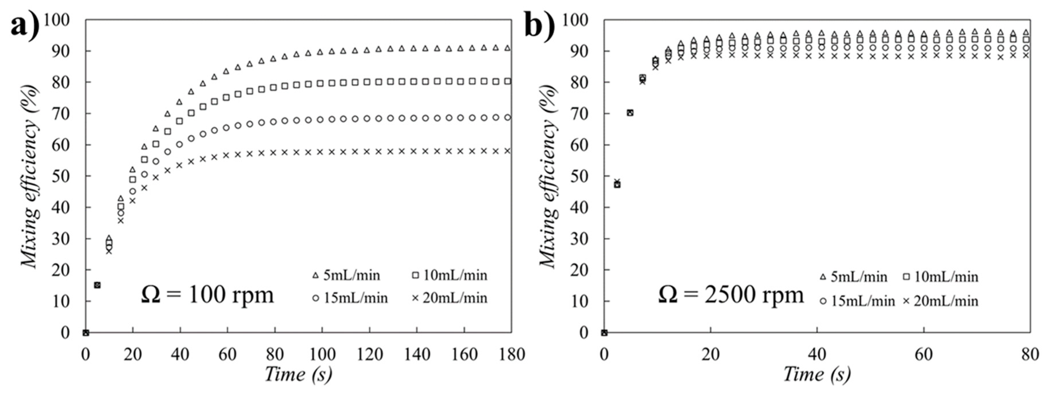 4.5. Effect of the Flow Rate on the Mixing Efficiency