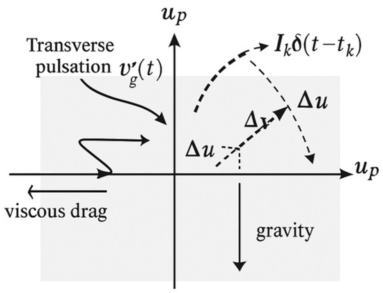 Figure 2 provides a conceptual view of the impulsive forcing term introduced in the governing equations, illustrating how discrete events produce instantaneous changes in the particle velocity components superimposed on the continuous motion.