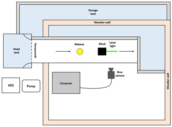 The experimental setup used in this study followed the same configuration described in [24] for continuous release experiments. All tests were performed in the recirculating Plexiglas flume located in the Fluid Mechanics Laboratory of the Glenn Department of Civil Engineering at Clemson University. The flume is 4.9 m long, 0.61 m wide, and 0.40 m deep, with a weir at the downstream end to maintain constant flow depth. The water in the flume is pumped using a stainless-steel centrifugal pump driven by a variable frequency drive (VFD).