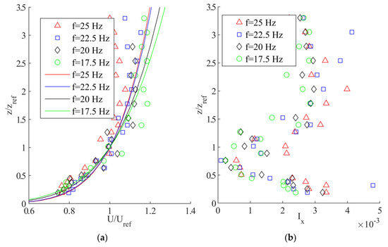 The flow velocity was measured using an acoustic Doppler velocimetry (ADV) probe. Boundary-layer profiles were collected at four pump frequencies without the model building installed. The measurements were taken at the location where the building would be placed for the experiments. A power-law fit described the mean profiles well. The reference velocity for each experiment was taken as the time-averaged ADV measurement at the building height (10 cm above the flume bed). The measured time-averaged velocity profiles are shown in Figure 3a. The boundary layer was formed by lining the upstream section of the flume bed with coarse gravel. The upstream fetch was approximately 3 m long and produced a boundary layer that is well described by a power-law function up to a height approximately 1.5–2 times the model building height. The turbulence intensity was also measured by the ADV, and the profiles are shown in Figure 3b.