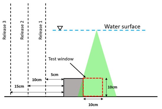 The experimental procedure followed the same protocol described in [25] for finite release tests. For each run, a balloon was filled with one of five volumes (100 mL, 200 mL, 300 mL, 400 mL, and 600 mL) of dyed saline solution and connected to a quarter-turn valve to remove air prior to placement. The balloon was positioned with the center of the balloon at one of three upstream distances of 5 cm, 10 cm, and 15 cm from the model building. A metal ruler was used to ensure consistent alignment with the flume centerline. A schematic diagram of the experimental setup showing the release distance, model building, laser light sheet, and viewing window for the experiments in Figure 4.