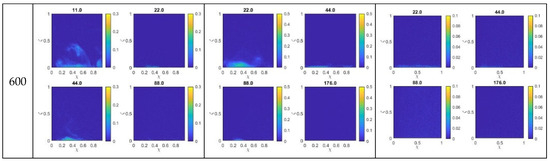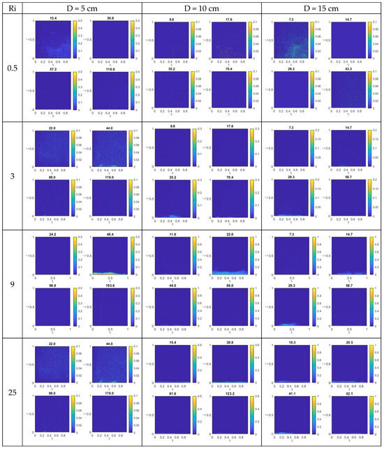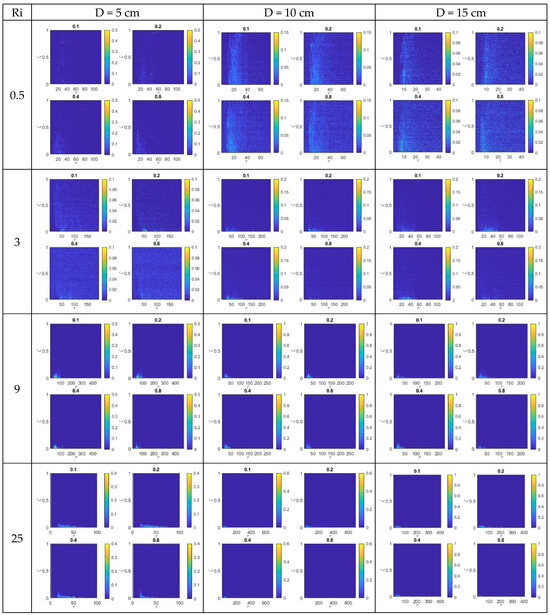 Figure 5 shows images of the instantaneous normalized concentration () at different times for three different upstream release distances and four Richardson numbers. The release volume is 300 mL for all cases. As previously reported in [25], there are three main flow regimes denoted as well-mixed, transitional, and layered. The well-mixed regime is characterized by concentration fields that are relatively uniform and distributed over much of the building wake. See, for example, the top left corner of Figure 5. The layered regime is characterized by a thin, lower-density layer with a sharp interface and relatively low concentration above the layer. See, for example, the case of Ri = 9 and D = 5 cm in Figure 5. The transitional regime has dense fluid occupying a significant depth within the wake, with the concentration increasing closer to the ground. See, for example, the case of Ri = 3 and D = 5 in Figure 5. In general, flows with a higher Richardson number are layered, while low Ri flows are well mixed. The exact transition points are discussed later.
