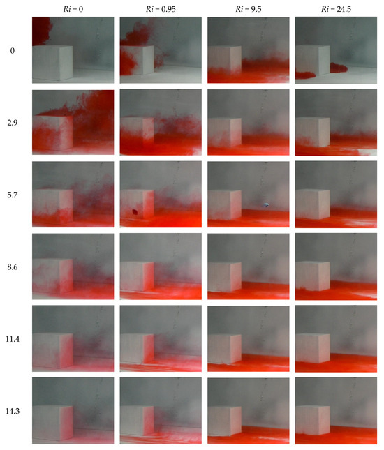 There are several possible cases for the interaction of the cloud with the building. Releases near the building will have little time to adjust before striking the front of the building. This is shown in Figure 14a,c. However, for clouds to be released further upstream, they could adjust before reaching the building. Low Ri clouds would be bigger and less dense on impact (Figure 14b), whereas high Ri clouds will have time to collapse (Figure 14d). Note that the schematic diagrams are based on observations outside the view of the camera setup used in these experiments, as they were focused on the behavior in the building wake downstream of the release. A series of visualization experiments was conducted using a color camera with the dense fluid dyed red and the test rig painted white. Images from this set of experiments are shown in Figure 15 and show the impact of cloud shape and size on the flow over and around the building for different Richardson numbers ().