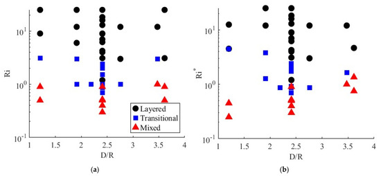 Flow regime as a function of Richardson number and D/R for (a) Richardson number , and (b) and . Note that there is a blue square and a black circle almost overlapping on in (b).