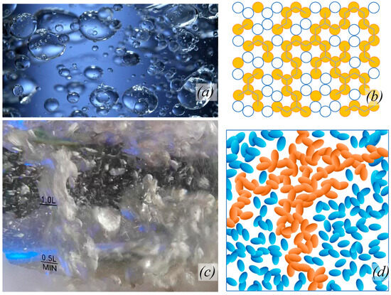 Illustration of the model. Different stages of water boiling: (a) initial, (c) developed, (b,d) and model geometric constructions for describing the boiling crisis. (b) The construction similar to that proposed by Sher and Zallen for a honeycomb lattice redrawn from [29] (explanation in text); (d) The continuum problem of percolation theory for overlapping ellipses, where the percolation cluster is highlighted in orange and the finite clusters are highlighted in blue.