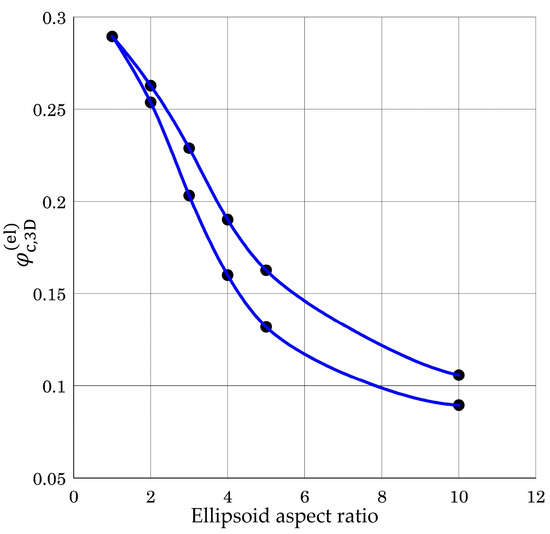 Dependence of the percolation threshold for a 3D continuum problem on overlapping ellipsoids on the aspect ratio of their axes according to computer simulation data [43,44].